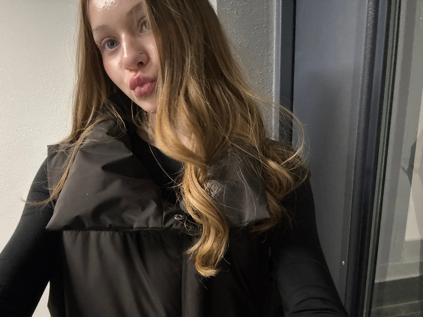 A woman with long, light brown hair is posing for a picture. She is wearing a black puffer jacket. The background includes a glass window and a white wall. The image is taken at an angle, with the wom…read more