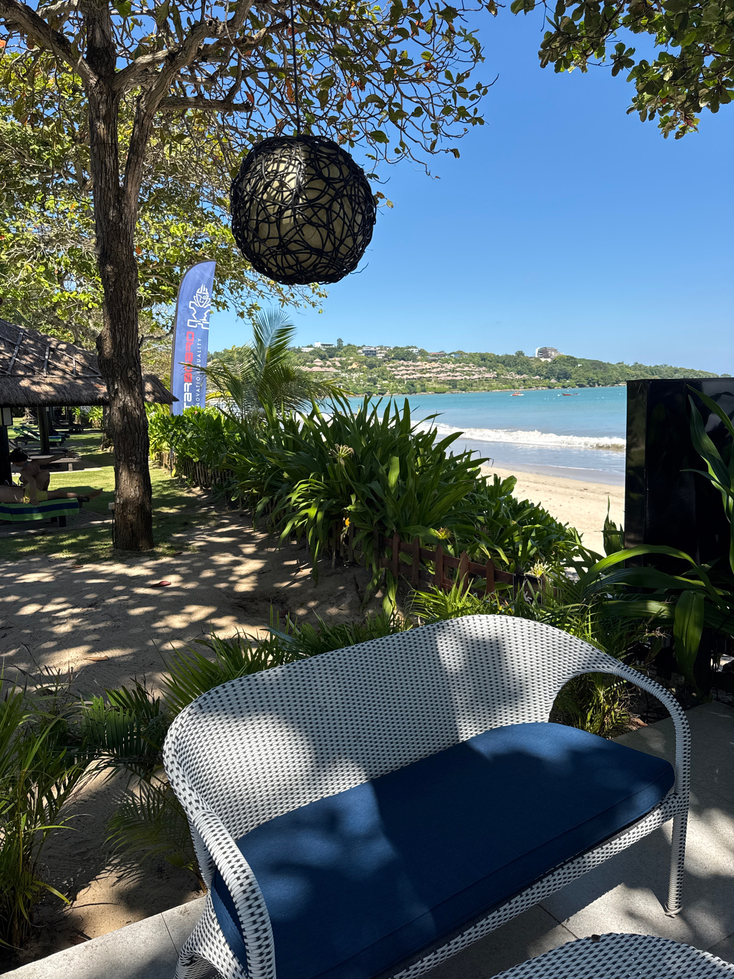 The scene is an outdoor view from what appears to be a patio or elevated area in Kuta Selatan, Indonesia, overlooking a beach. The ocean can be seen in the distance, with a sandy beach stretching alon…read more