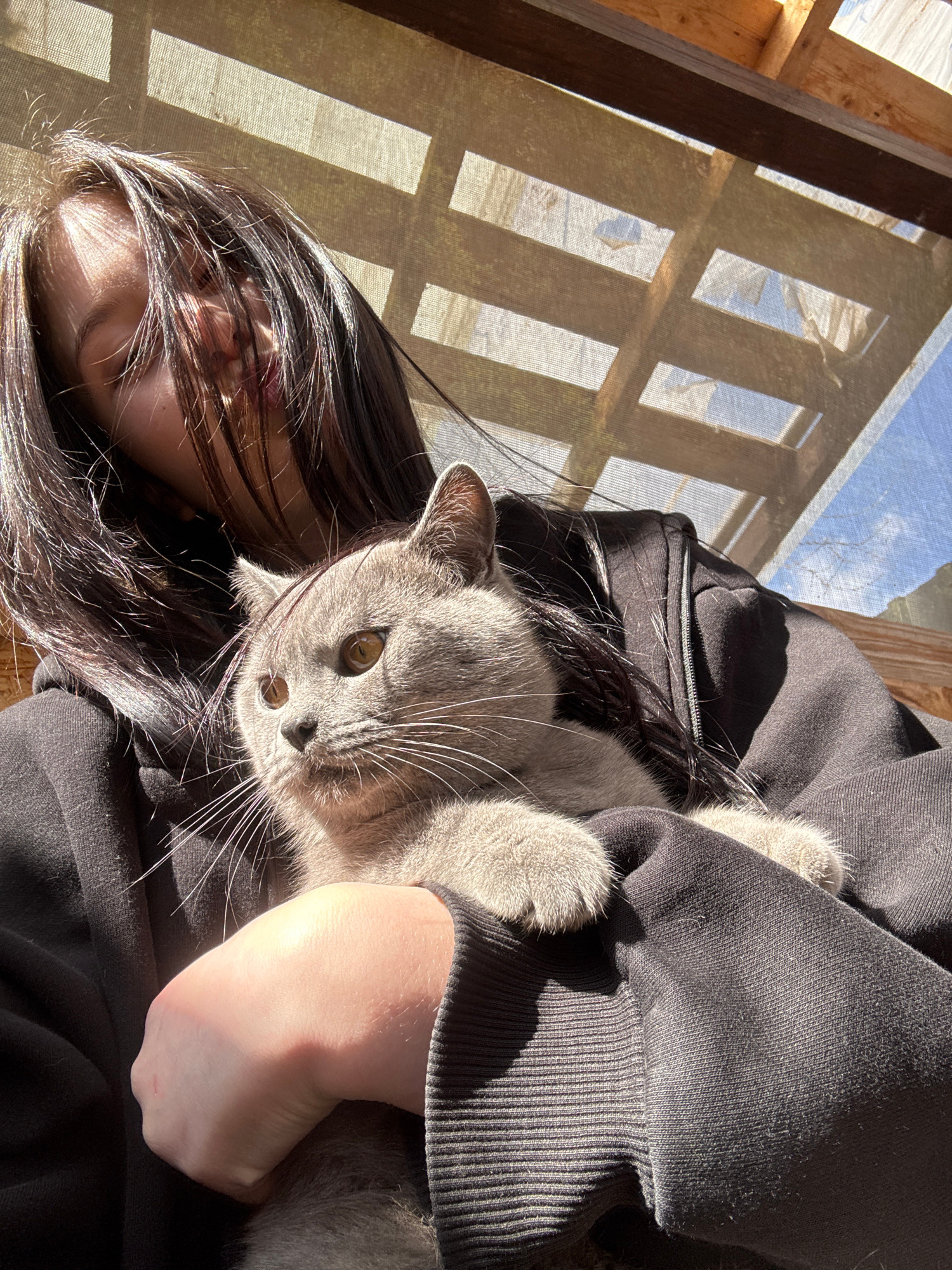 A woman with long, dark hair is holding a grey cat in her arms. She's wearing a black hooded sweatshirt. The cat is looking at the camera with yellow eyes. Sunlight is filtering through a wooden latti…read more
