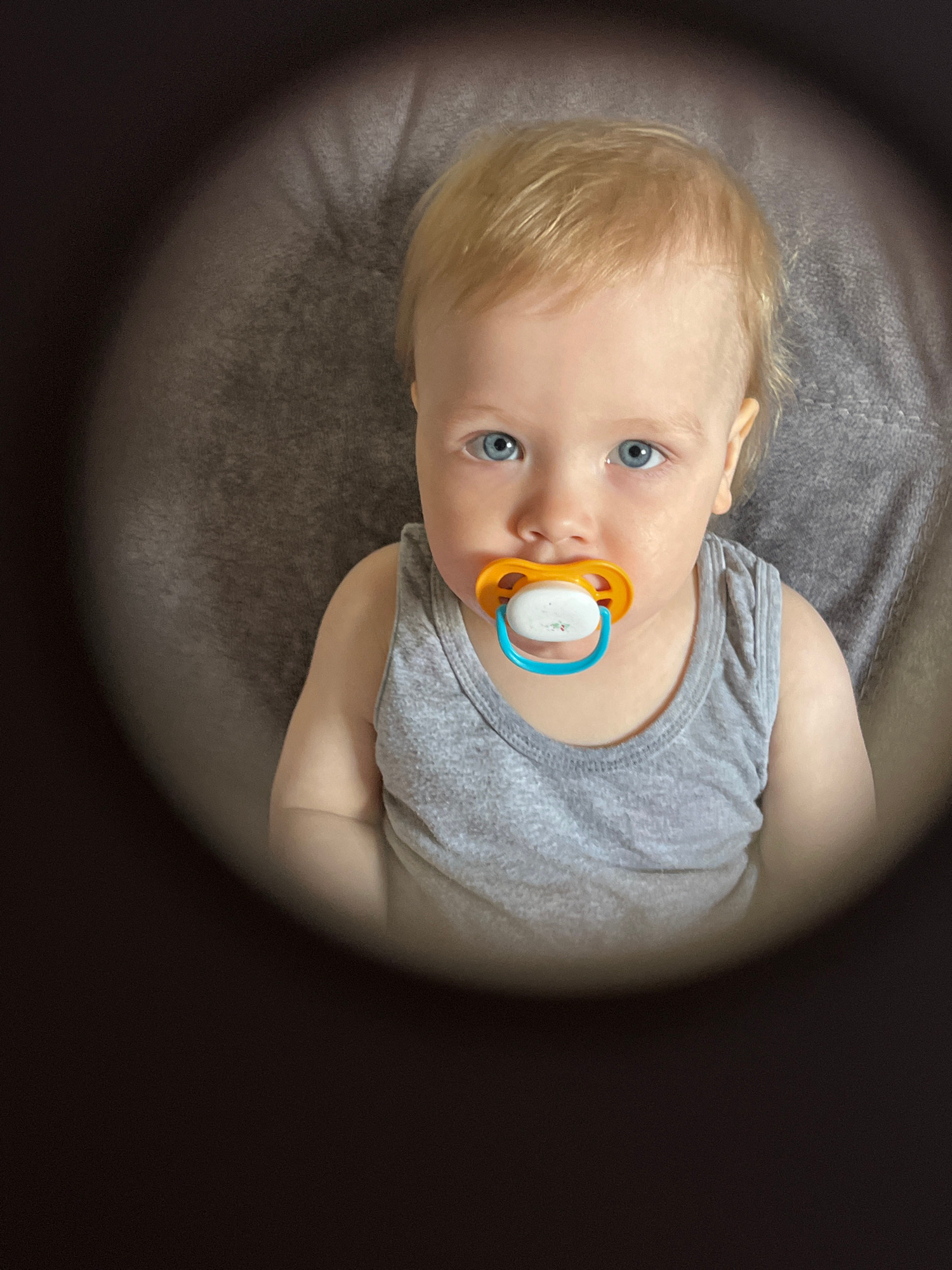 A fair-skinned infant with blond hair and blue eyes lies on a gray, textured surface while wearing a gray sleeveless shirt. The infant has a pacifier with an orange guard and blue handle in its mouth.…read more