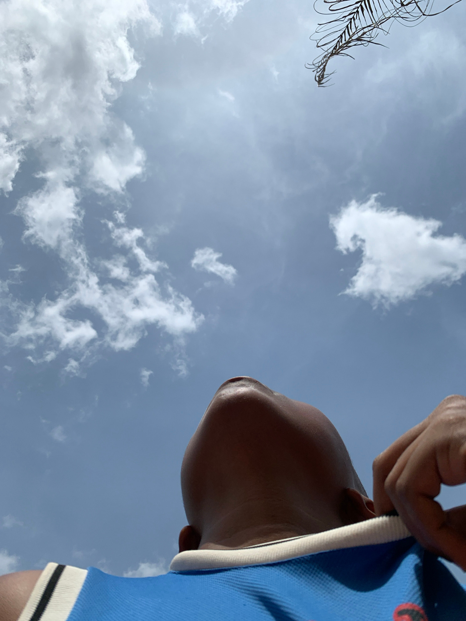 A low-angle shot captures a person viewed from below against a bright blue sky with scattered white cumulus clouds. The person, positioned in the lower right section of the frame, has a dark skin toneβ¦read more