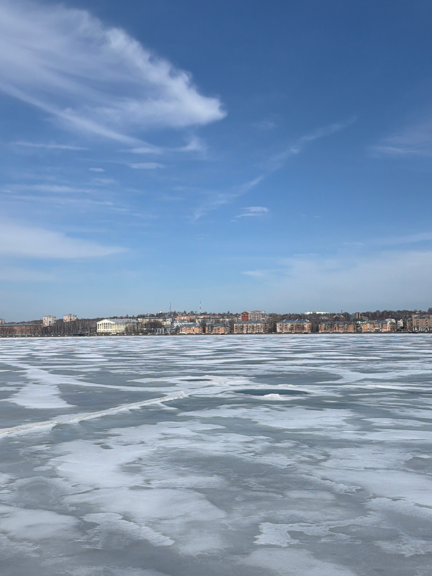 The image depicts a waterfront scene in Votkinsk, Russia. On the left side, a clear blue sky with wispy clouds is visible. The right side shows a frozen body of water, likely the Votkinsk Reservoir,…read more