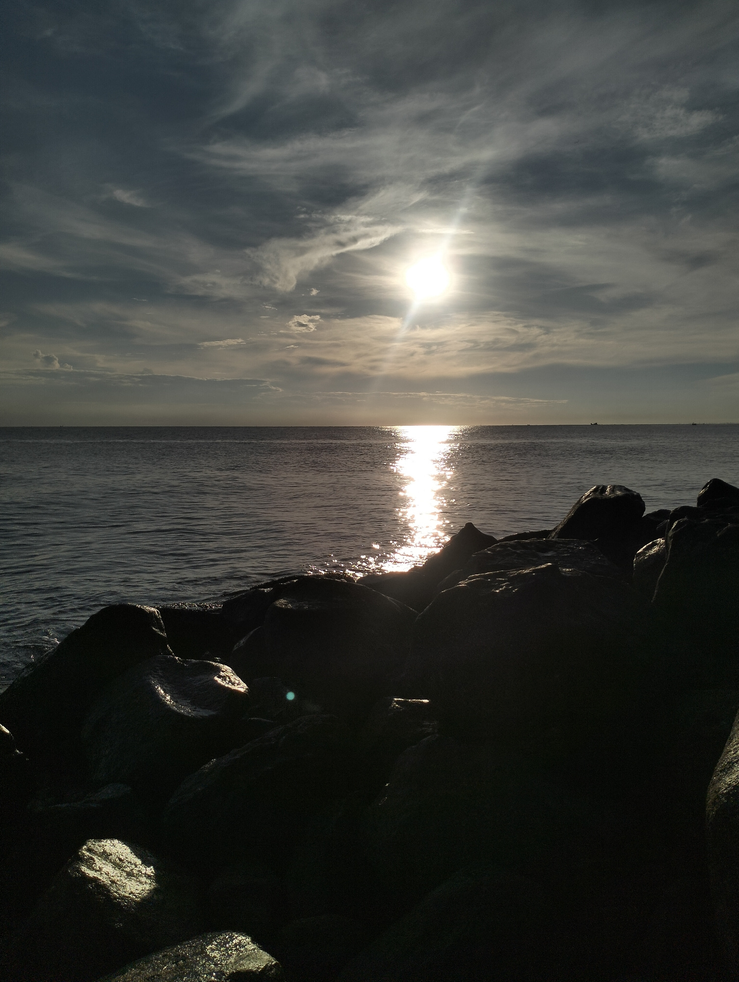 A landscape image shows the ocean, sky, and rocks. The sky is cloudy with the sun shining through the clouds. The sun's reflection shines down the ocean. In the foreground are dark, wet rocks. Lhokseu…read more