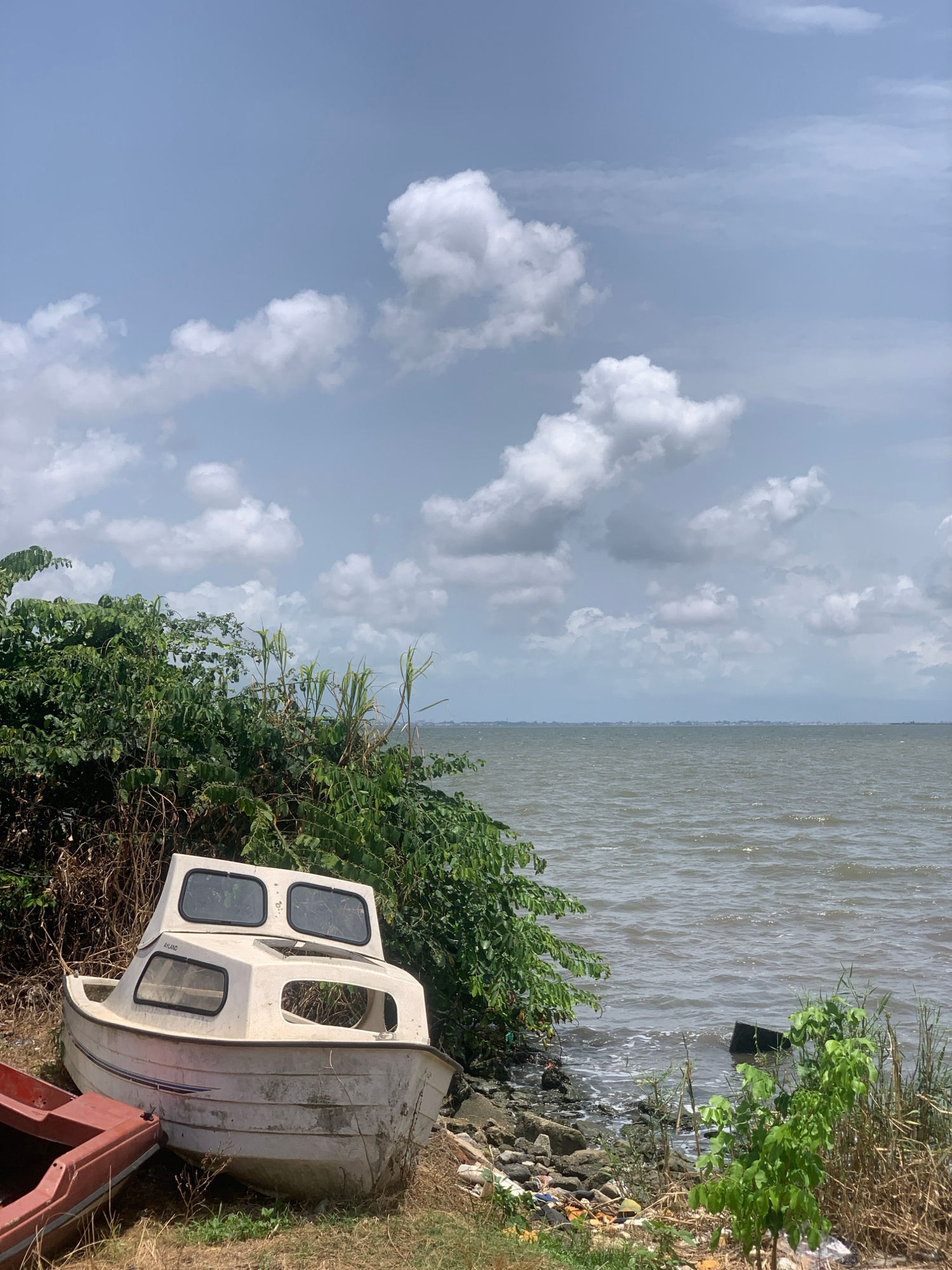 The image depicts a shoreline scene in Lekki, Nigeria. The sky is partly cloudy. The water is murky. The foreground shows vegetation growing along the shore. A derelict white boat with a cabin sits pa…read more