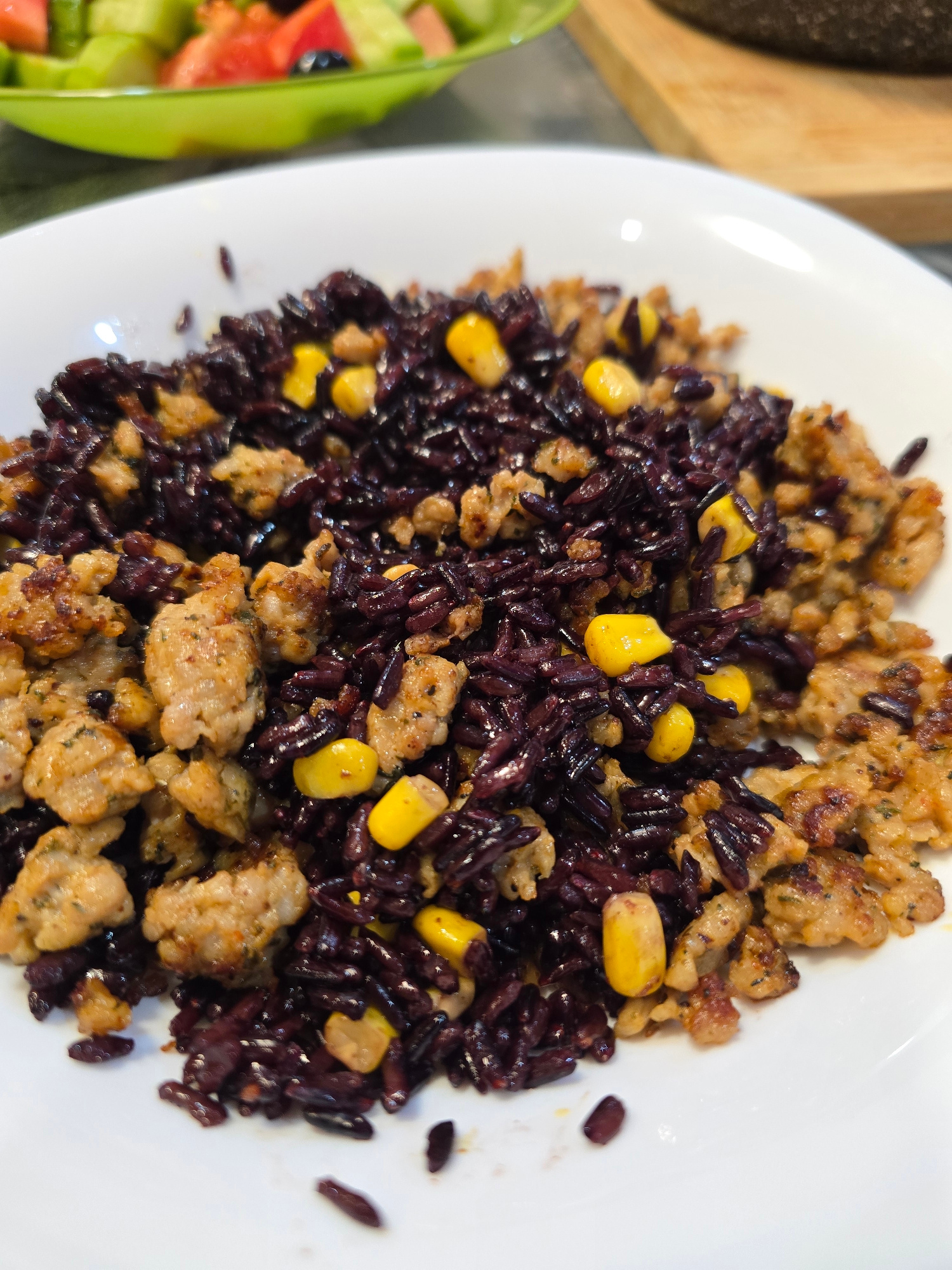 A high-angle, close-up shot showcases a white plate filled with a mixture of black rice, corn kernels, and cooked ground meat. A container of salad is partially visible on the left side of the frame,…read more