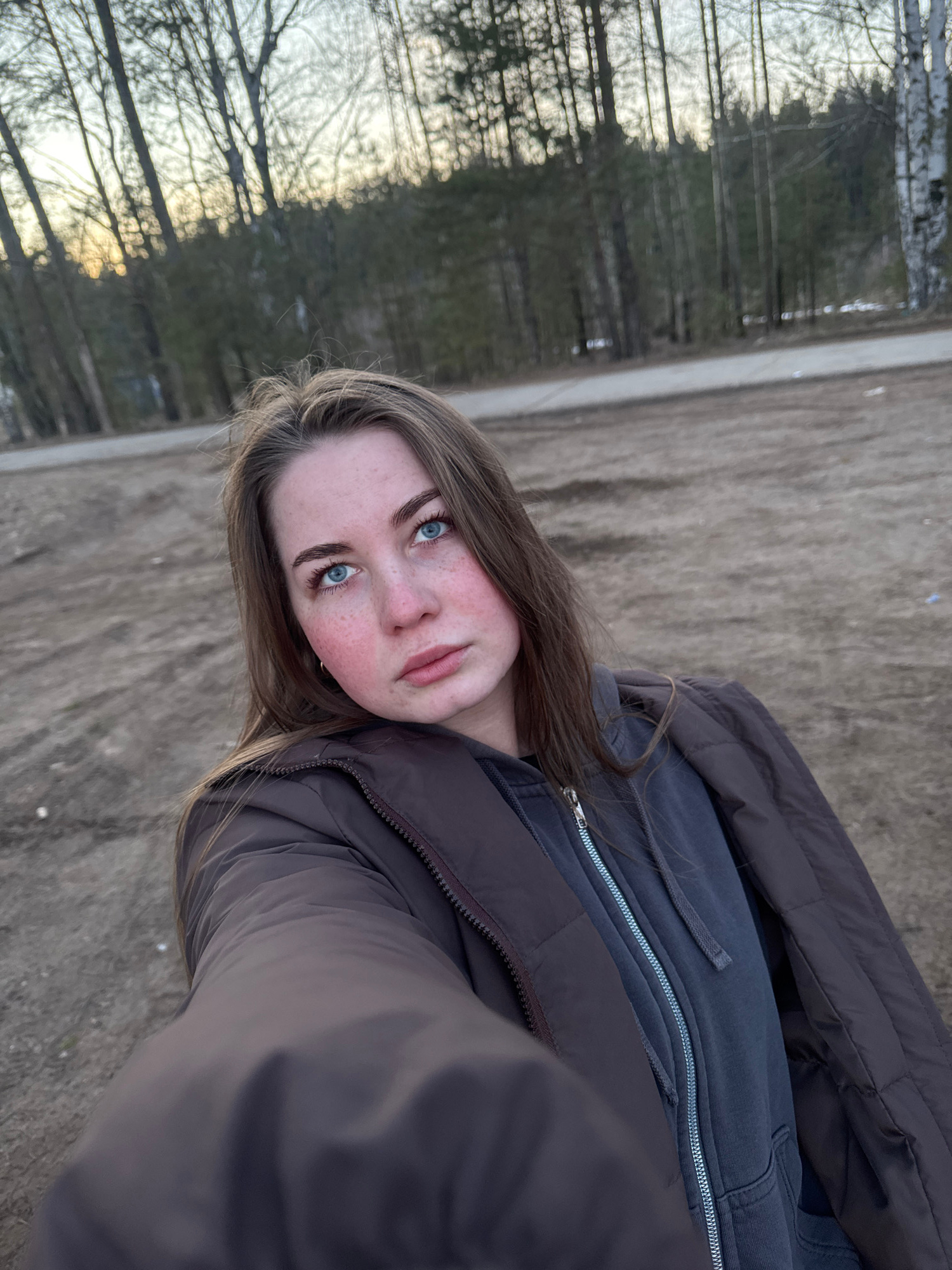 A person is centered in the frame in an outdoor setting. The person has fair skin, brown hair, and blue eyes with noticeable freckles on their cheeks and nose. They are wearing a dark gray zip-up jack…read more