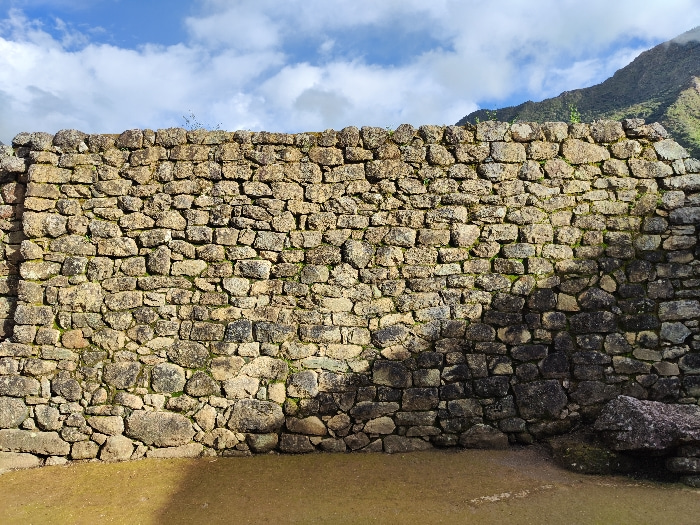 A weathered stone wall dominates the scene, constructed from irregular, earth-toned rocks. Patches of moss and shadow add depth and texture. A mountain ridge rises in the background under a partly clo…read more