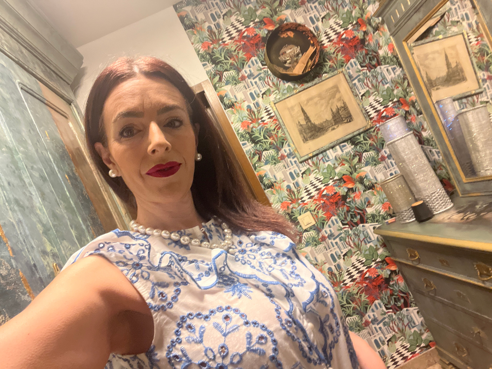 A woman with auburn hair, wearing a white blouse with blue embroidery and a pearl necklace, is positioned in front of a wall with floral patterned wallpaper. The wallpaper features red flowers and gre…read more