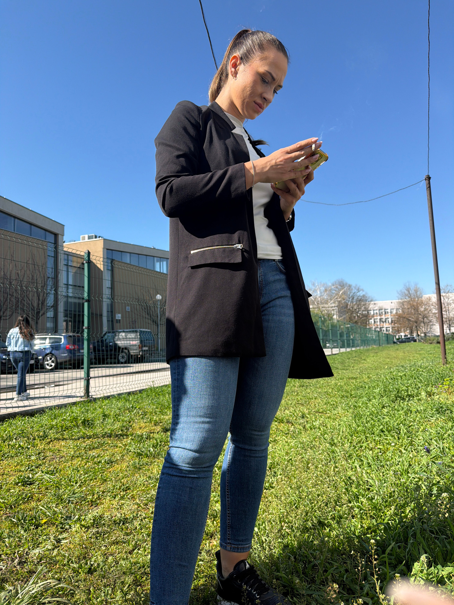 A woman is standing outdoors, likely in a park or grassy area. She is holding a mobile phone in one hand and appears to be smoking a cigarette with the other hand. She is dressed in a black blazer ove…read more