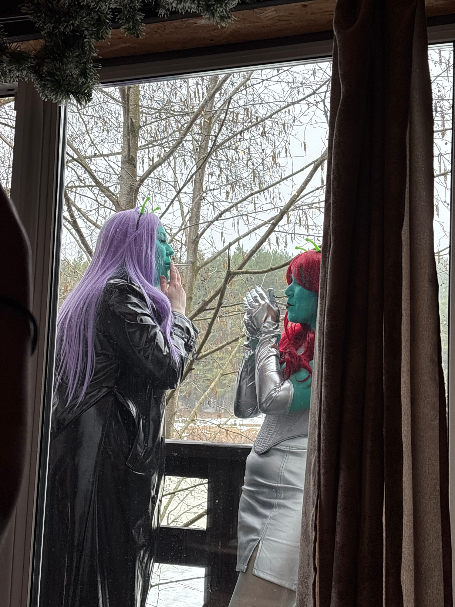 The image, likely taken indoors, shows two individuals reflected in a window with a curtain partially obscuring the top. The background visible through the window reveals bare tree branches. One indiv…read more