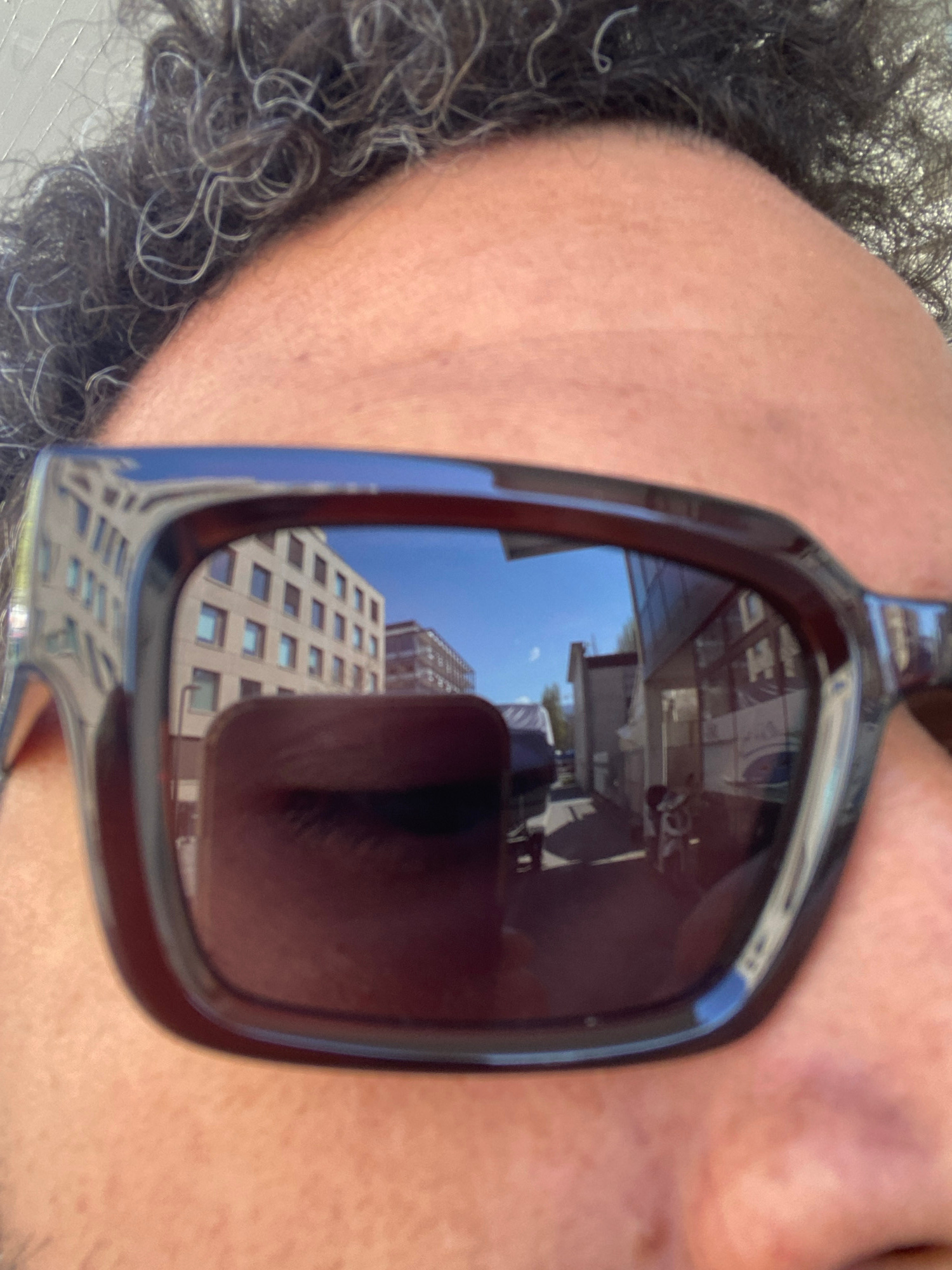 The image shows a close-up view of a person wearing sunglasses. The reflection in the sunglasses reveals a building with a grid-like pattern of windows against a blue sky. The reflection suggests an uā¦read more