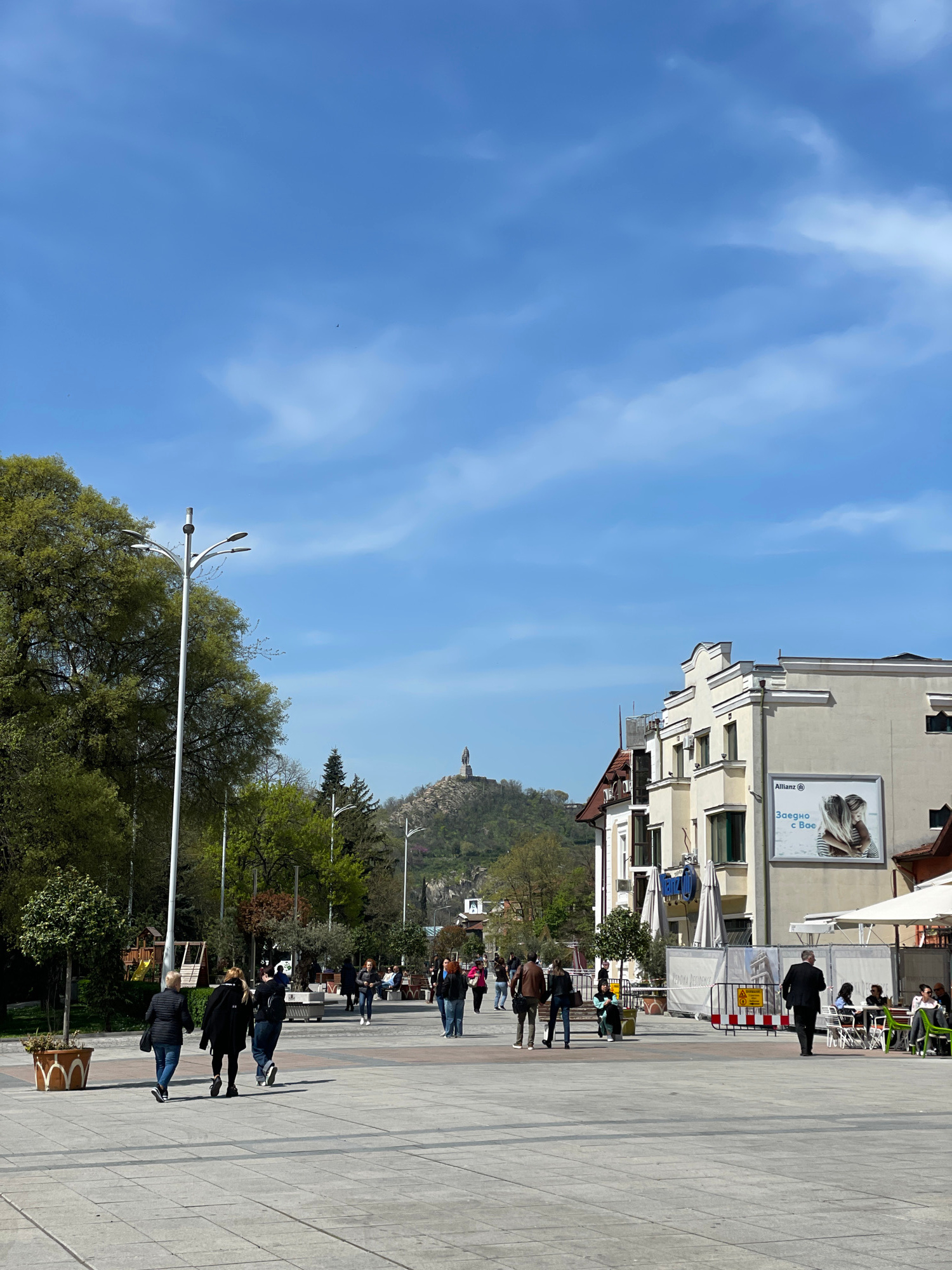 This image captures a vibrant pedestrian street scene in Plovdiv, Bulgaria, under a clear blue sky with sparse, wispy clouds. The perspective looks down a wide, paved walkway lined on one side by buil…read more