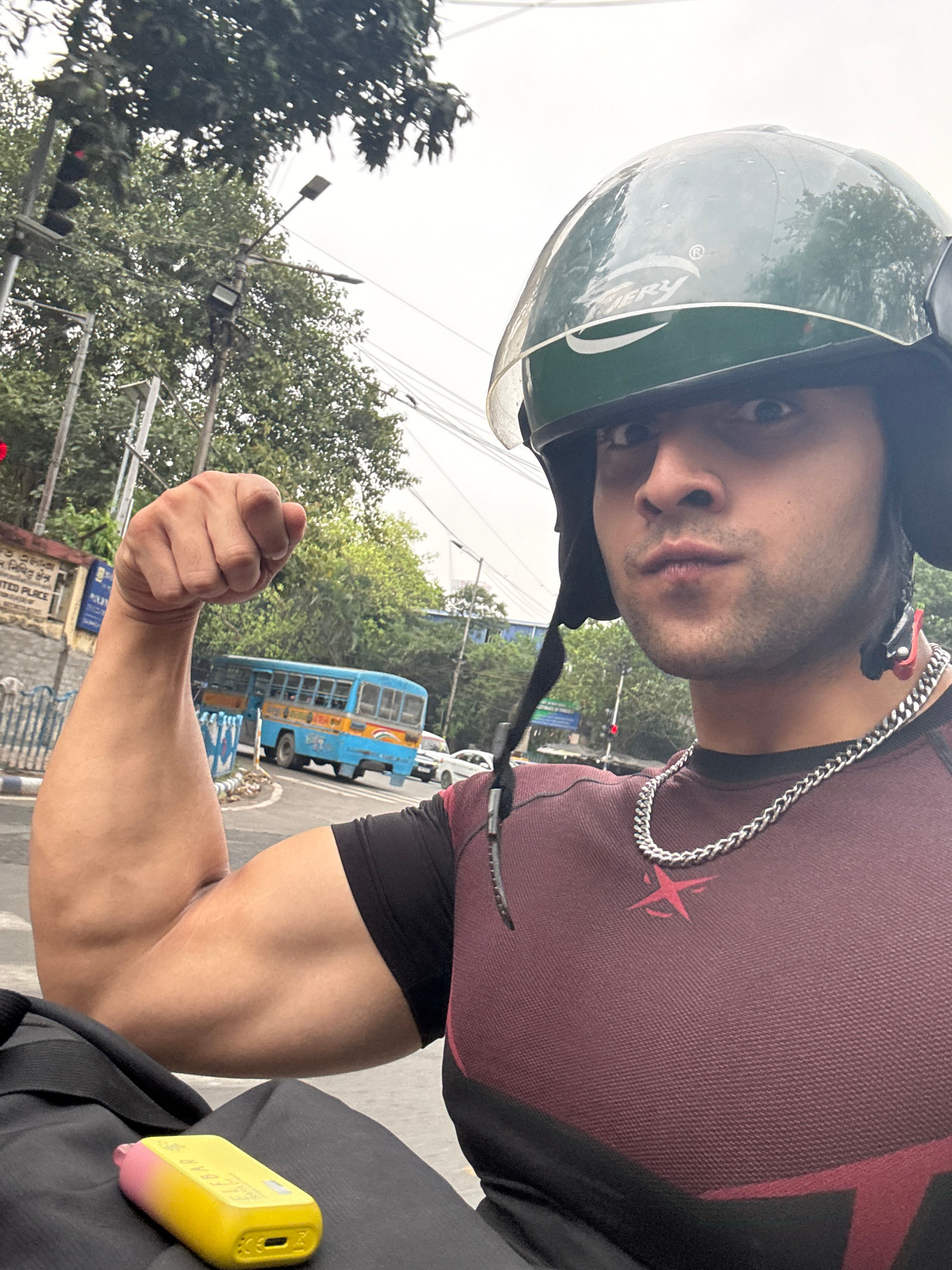 A man wearing a green helmet, a burgundy shirt with a red star, and a silver chain is flexing his bicep in what appears to be a selfie taken on a vehicle. In the background, a blue bus with yellow strβ¦read more