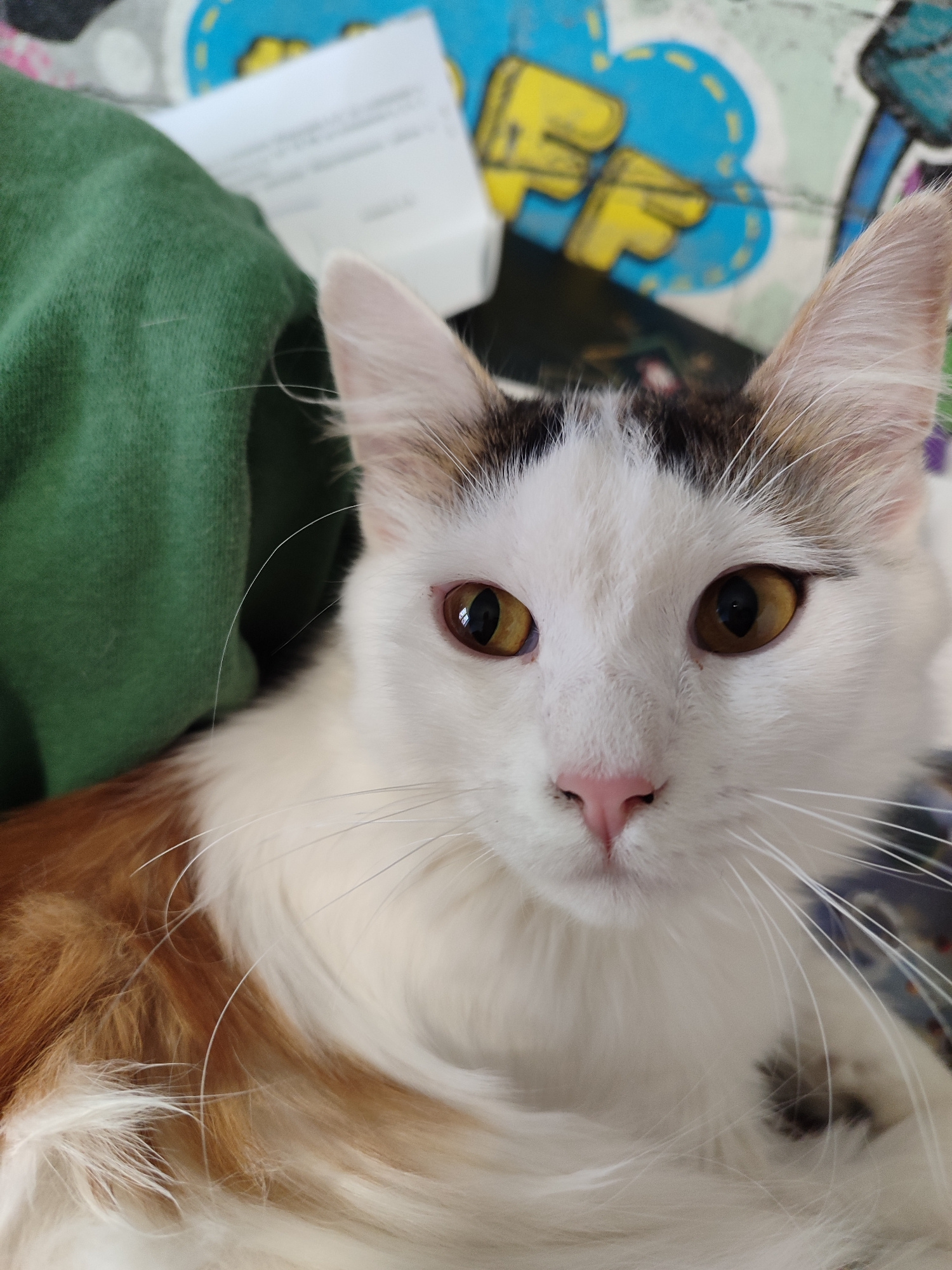A close-up, eye-level shot features a domestic cat looking directly at the camera. The cat has striking white fur covering most of its face and chest, with patches of dark brown or black fur on top ofโฆread more