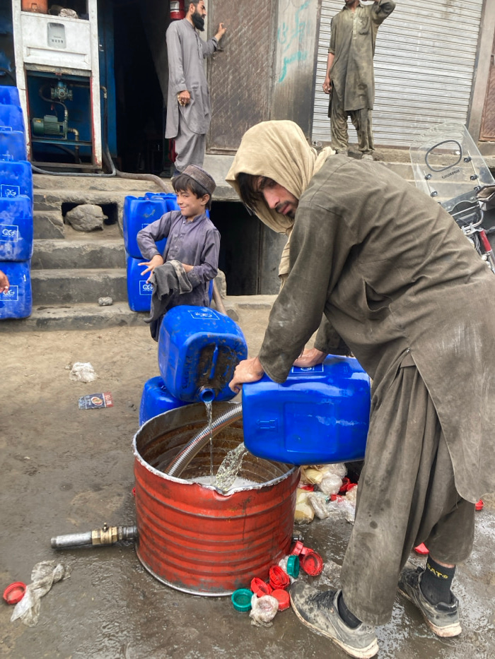 This image depicts an outdoor scene in Quetta City Tehsil, Pakistan, showing a liquid transfer operation amidst an urban environment. In the foreground, a man, likely in his 20s, wearing a dirty, ligβ¦read more