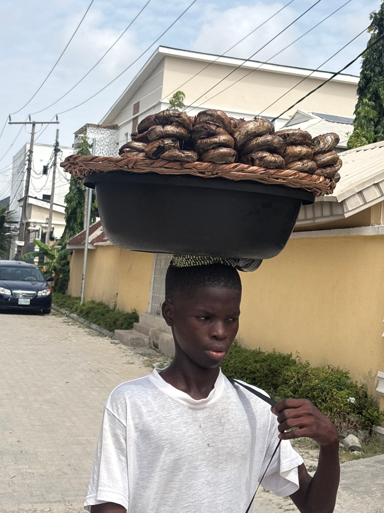 A young man walks along a paved street in Igboefon, Nigeria, carrying a large, round basket filled with smoked fish on his head. The basket is black with a brown woven rim. He wears a white T-shirt anβ¦read more