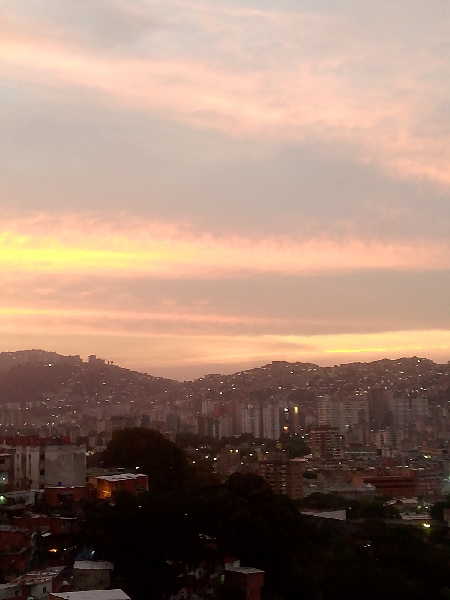 The image shows a cityscape at dusk in Caracas, Venezuela. The sky is filled with horizontal layers of pink and yellow clouds. Below, a densely populated urban area extends to the base of the hills inβ¦read more