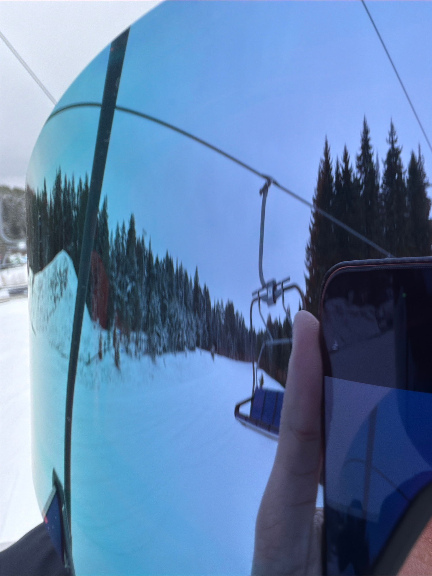 The image presents a close-up perspective from behind a reflective surface, likely ski goggles or a helmet visor, capturing a vibrant reflection of a winter mountain environment. The reflection promin…read more