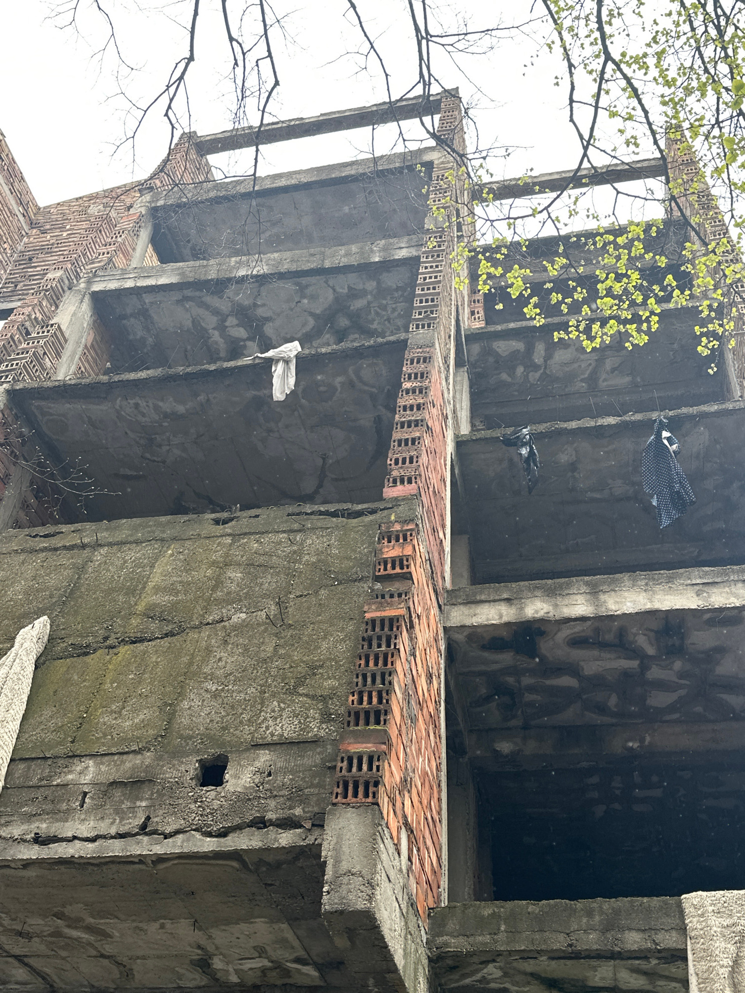 The image is a low-angle shot of the dilapidated, skeletal remains of a multi-story building, likely in Stara Zagora, Bulgaria. The architecture is characterized by bare concrete pillars and beams pun…read more