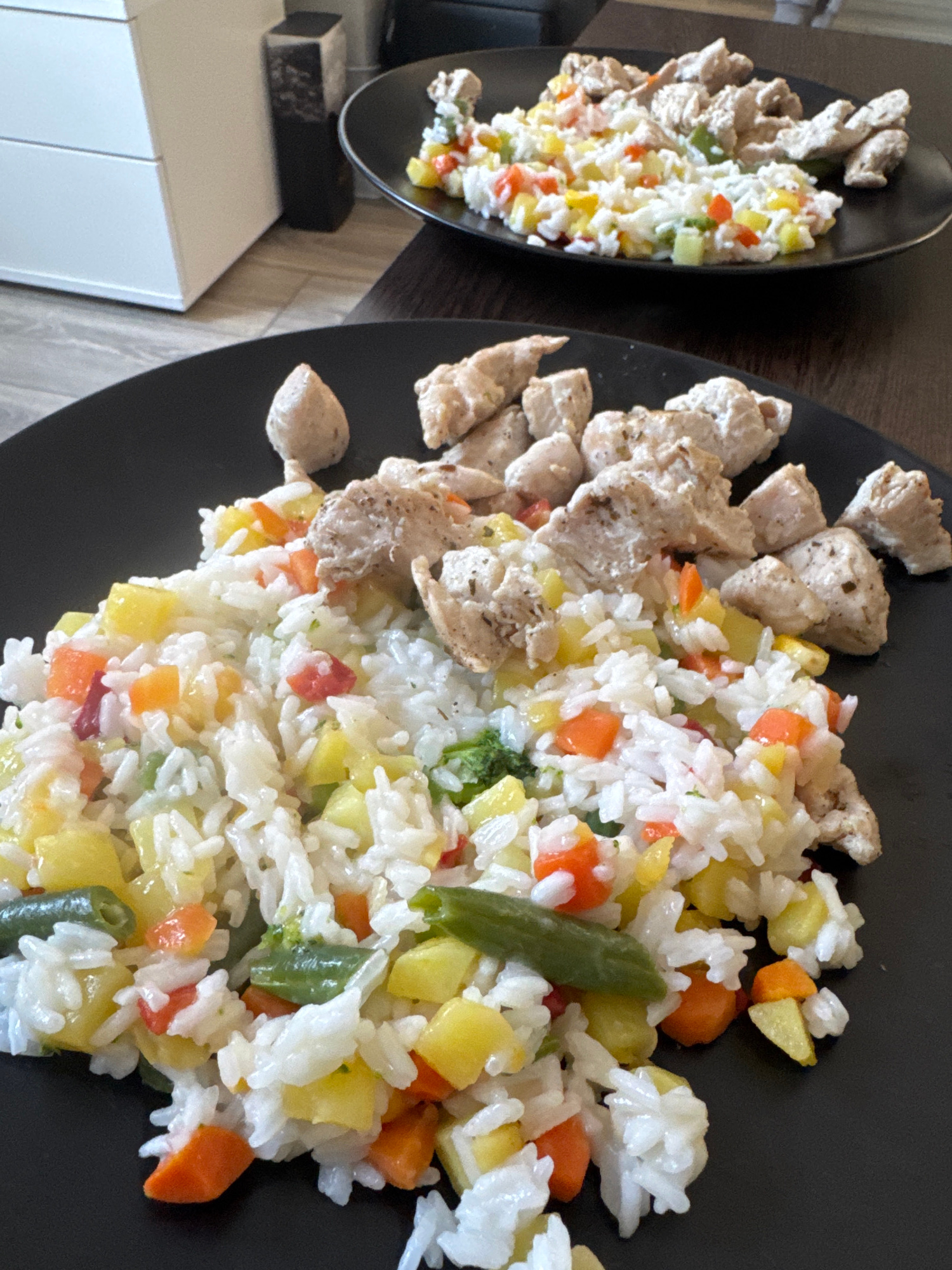 Two black plates of food are on a dark brown surface. Each plate contains cooked rice mixed with diced vegetables, including carrots, yellow squash, tomatoes, and green beans. Diced pieces of cooked cā¦read more