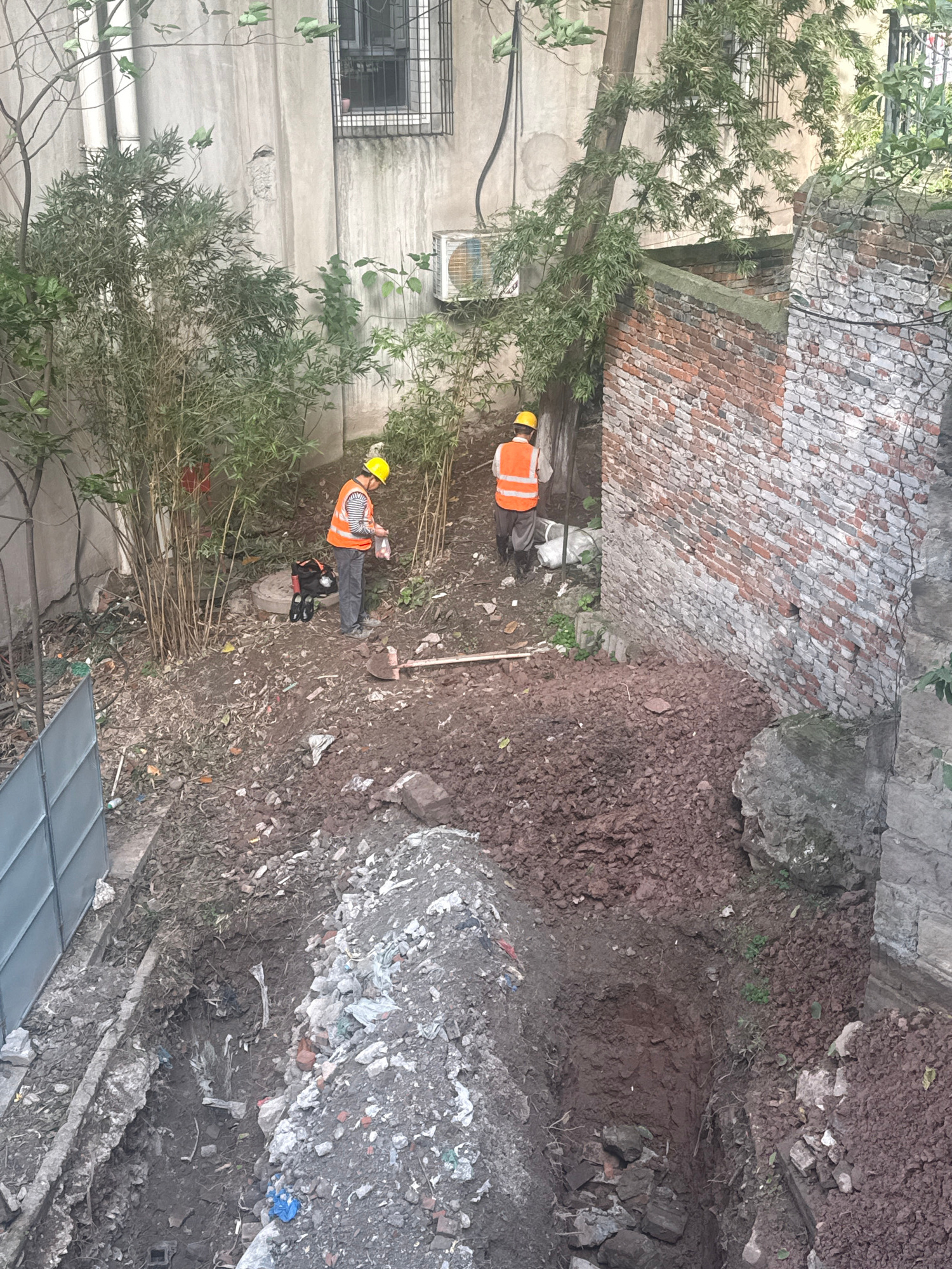The image captures an outdoor scene at what appears to be a construction or excavation site during daytime. The ground is largely composed of disturbed earth, piles of dark brown soil, and lighter-col…read more