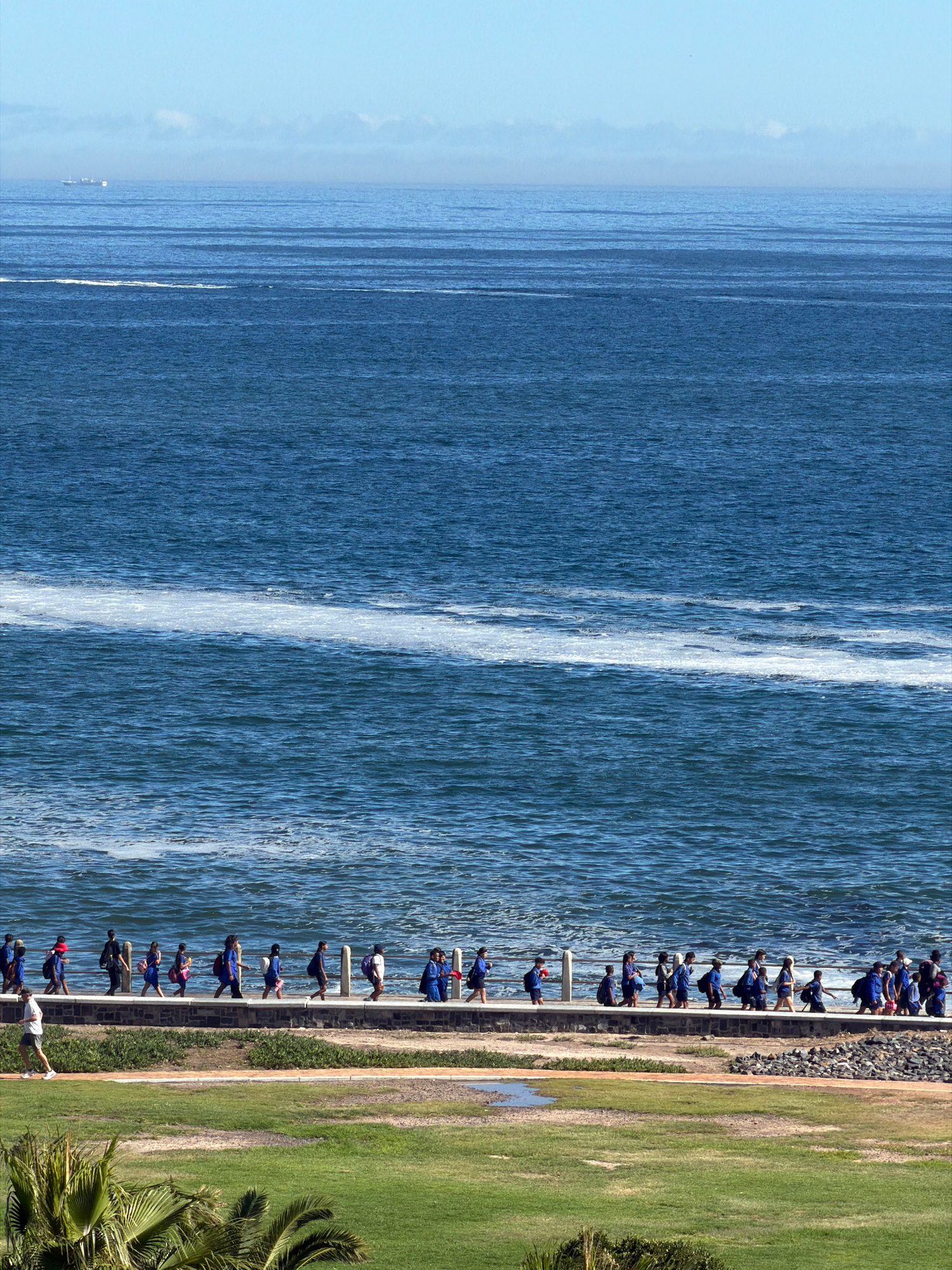 The image depicts a scene in Cape Town, South Africa. A group of people, mostly dressed in blue uniforms, are seen on a cement pier overlooking the ocean. There is a grassy area next to the pier, and…read more