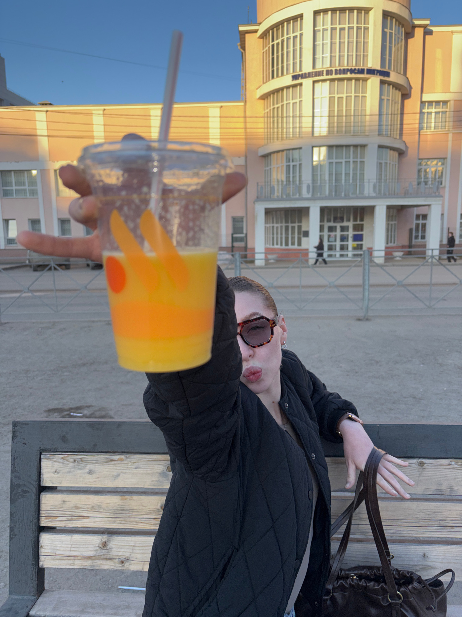 A person is seated on a bench in Perm, Russia, holding a cup of orange liquid. The person is wearing sunglasses and a black quilted jacket. A black bag is next to the person on the bench, which is mad…read more