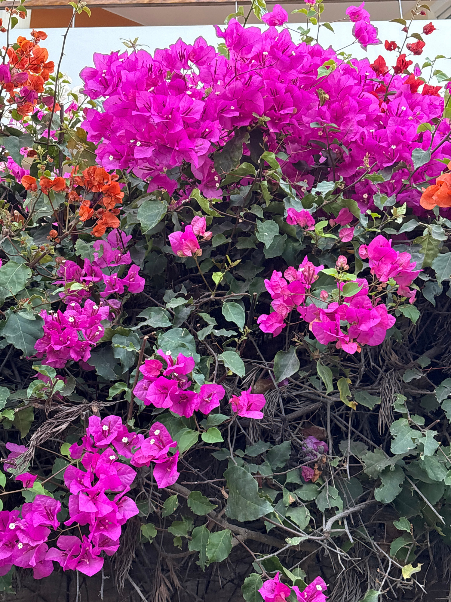 A vibrant, close-up vertical shot features a dense mass of flowering bougainvillea. The dominant color is a striking fuchsia or magenta, with numerous clusters of bright orange flowers interspersed, p…read more