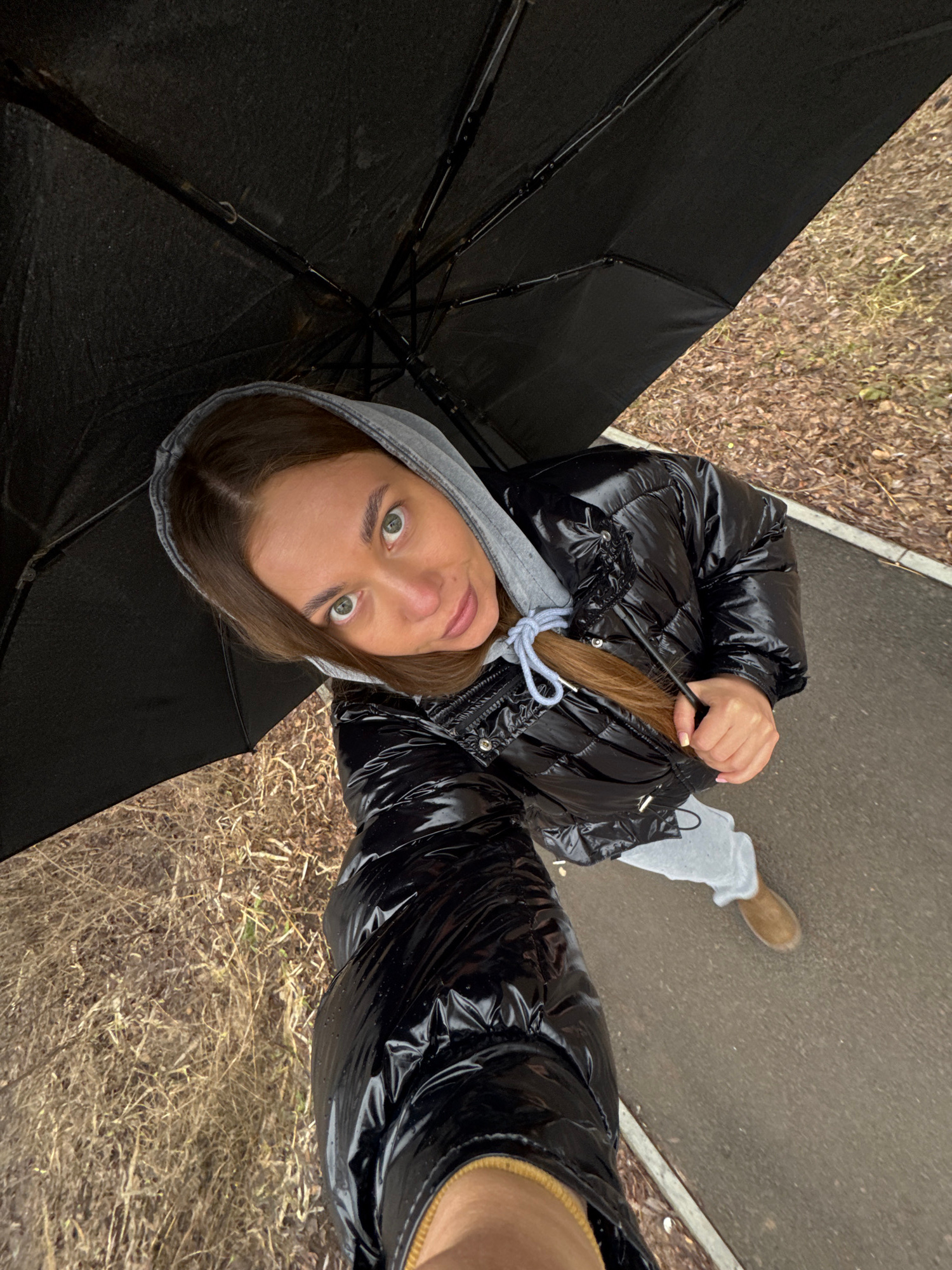 A young woman stands beneath a black umbrella, seemingly taking a selfie from a high angle. She wears a shiny black puffer jacket over a gray hooded sweatshirt, light gray sweatpants, and brown Ugg-st…read more