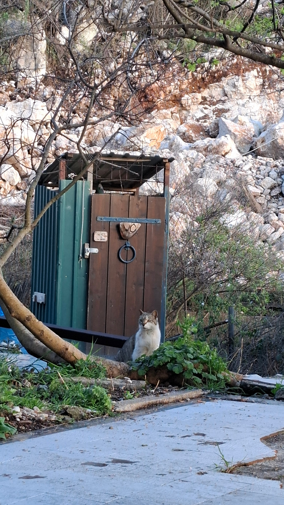 The image shows a cat sitting atop a structure that appears to be a shed or small building with a brown wooden door. The structure is situated near a stone wall or rock formation, with some greenery a…read more