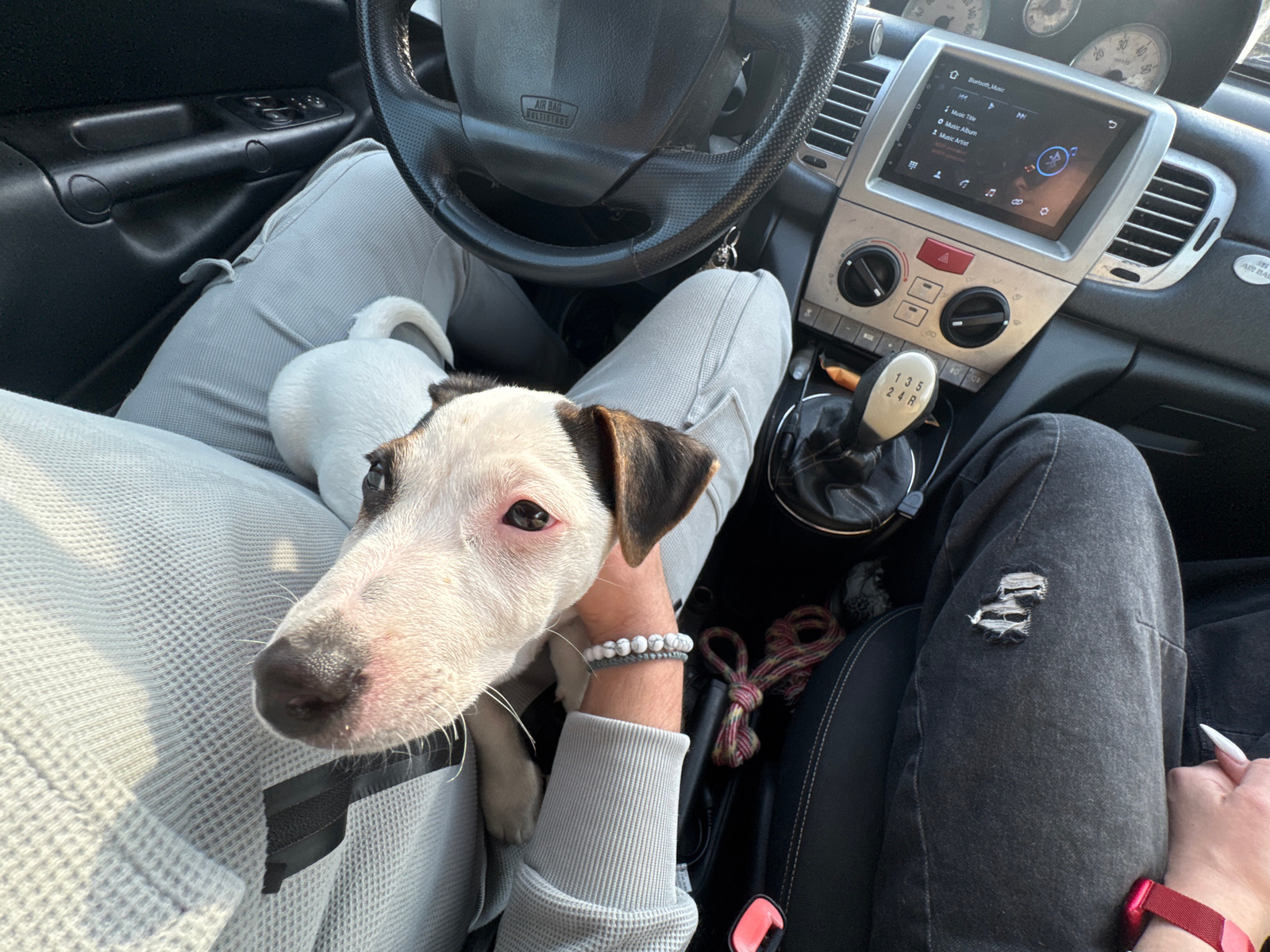 A close-up interior shot of a car, likely in Plovdiv, Bulgaria, given the car's dashboard layout is that of a Lancia Ypsilon (often seen in Europe). The central focus is a white and brown dog nestled…read more