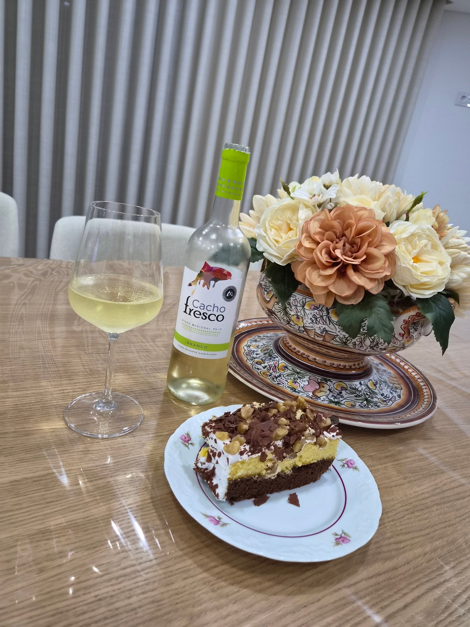 The scene is a still life arrangement on a light-colored wooden table, likely indoors given the presence of blinds in the background. A bouquet of artificial flowers, featuring cream-colored roses and…read more