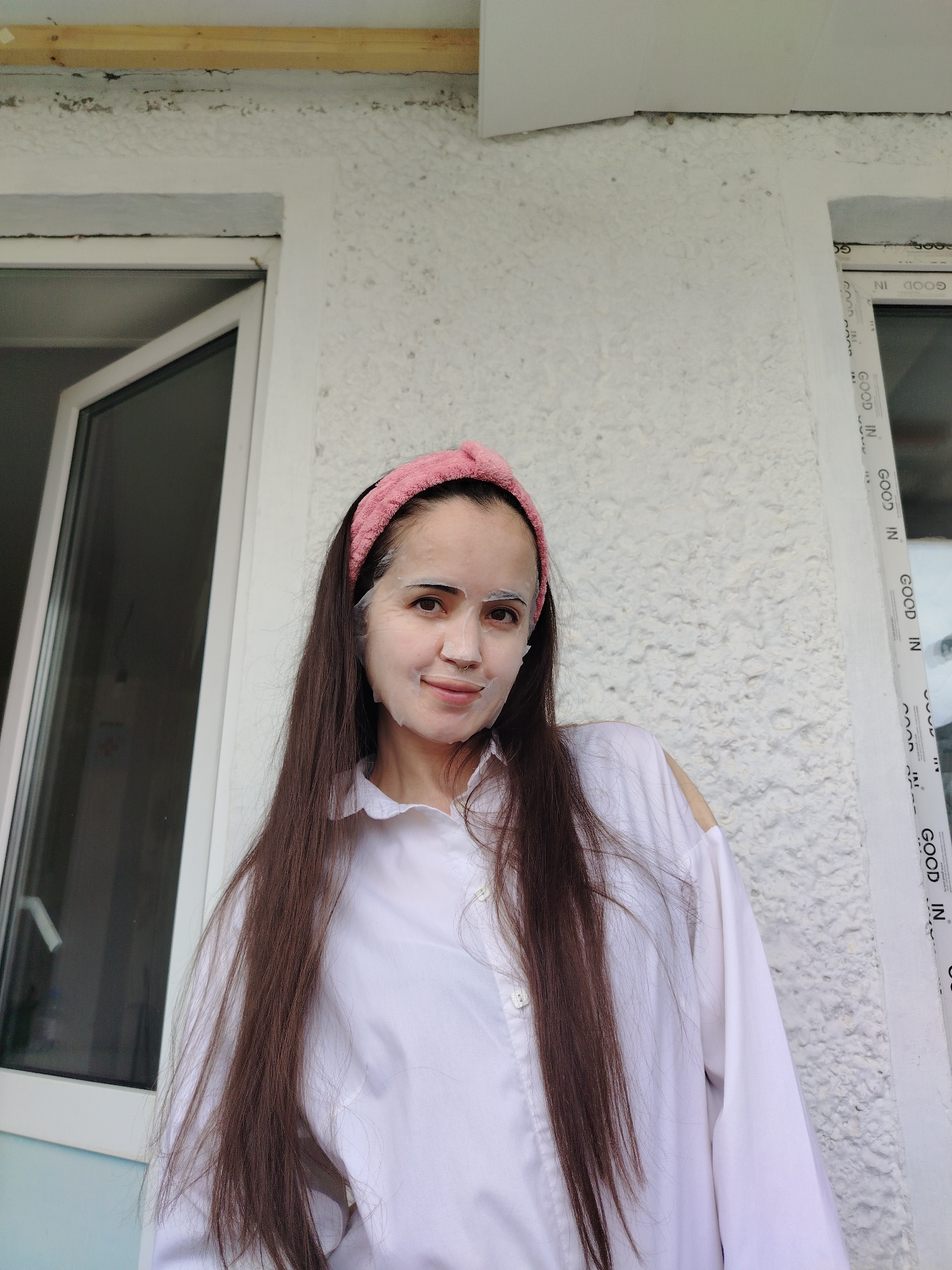 A young woman stands facing the viewer, captured in a brightly lit, medium-shot portrait. She has long, dark brown hair that flows over her shoulders and down her chest. On her head, she wears a pink,β¦read more