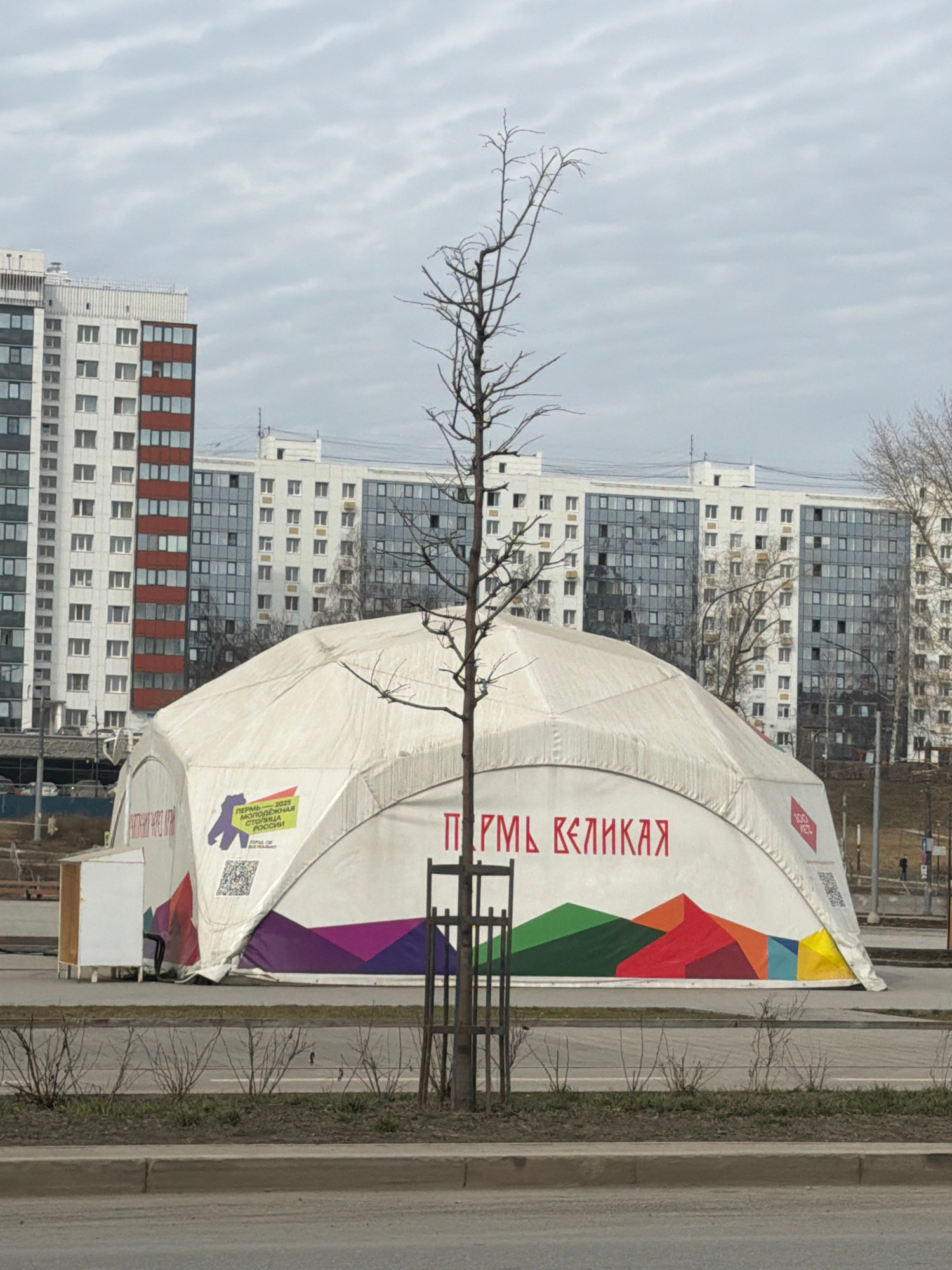 A slightly high-angle, outdoor shot captures a city street in Perm, Russia. A barren tree stands prominently in the foreground, its leafless branches reaching across the scene. Behind the tree is a la…read more