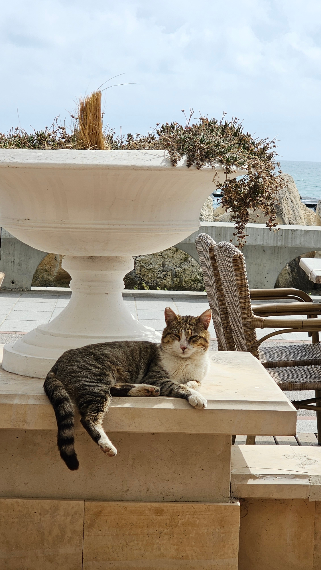 A tabby cat rests on a stone ledge beside a planter in Balchik, Bulgaria. The planter, situated to the left, is filled with dry, overgrown plants. Adjacent to the cat are a set of wicker chairs positi…read more