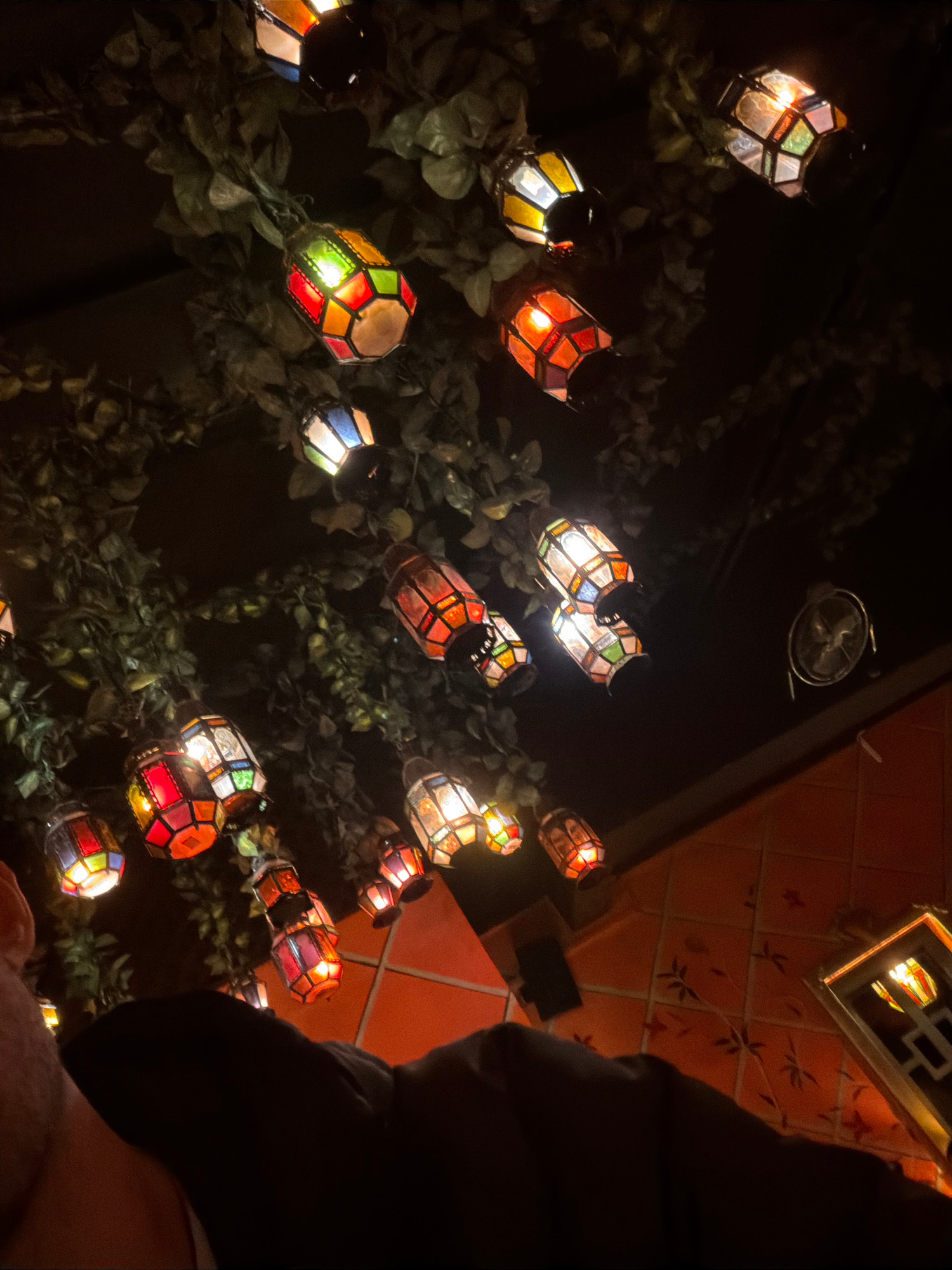 The image shows a night scene with decorative lanterns hanging among green foliage. The lanterns are multicolored, casting a warm glow. A ceiling fan is visible in the upper center of the frame. In th…read more