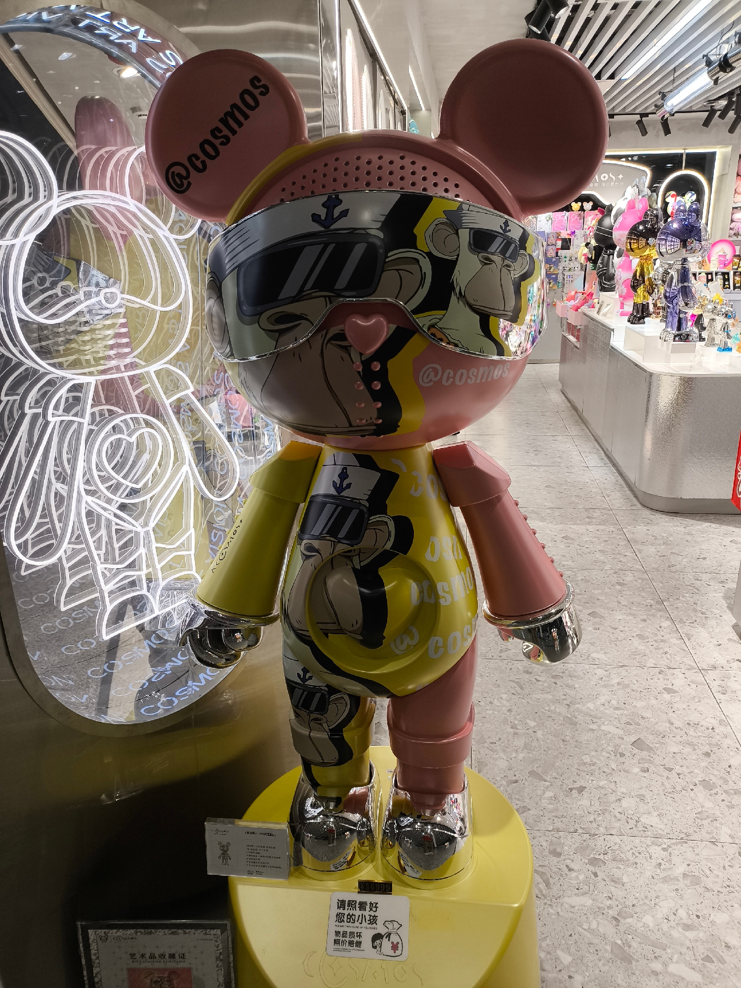 Here's a detailed description of the image: **Scene:** The image shows a large, decorative art piece of a bear-like character, likely a display in a retail environment. **Subject:** * The central…read more