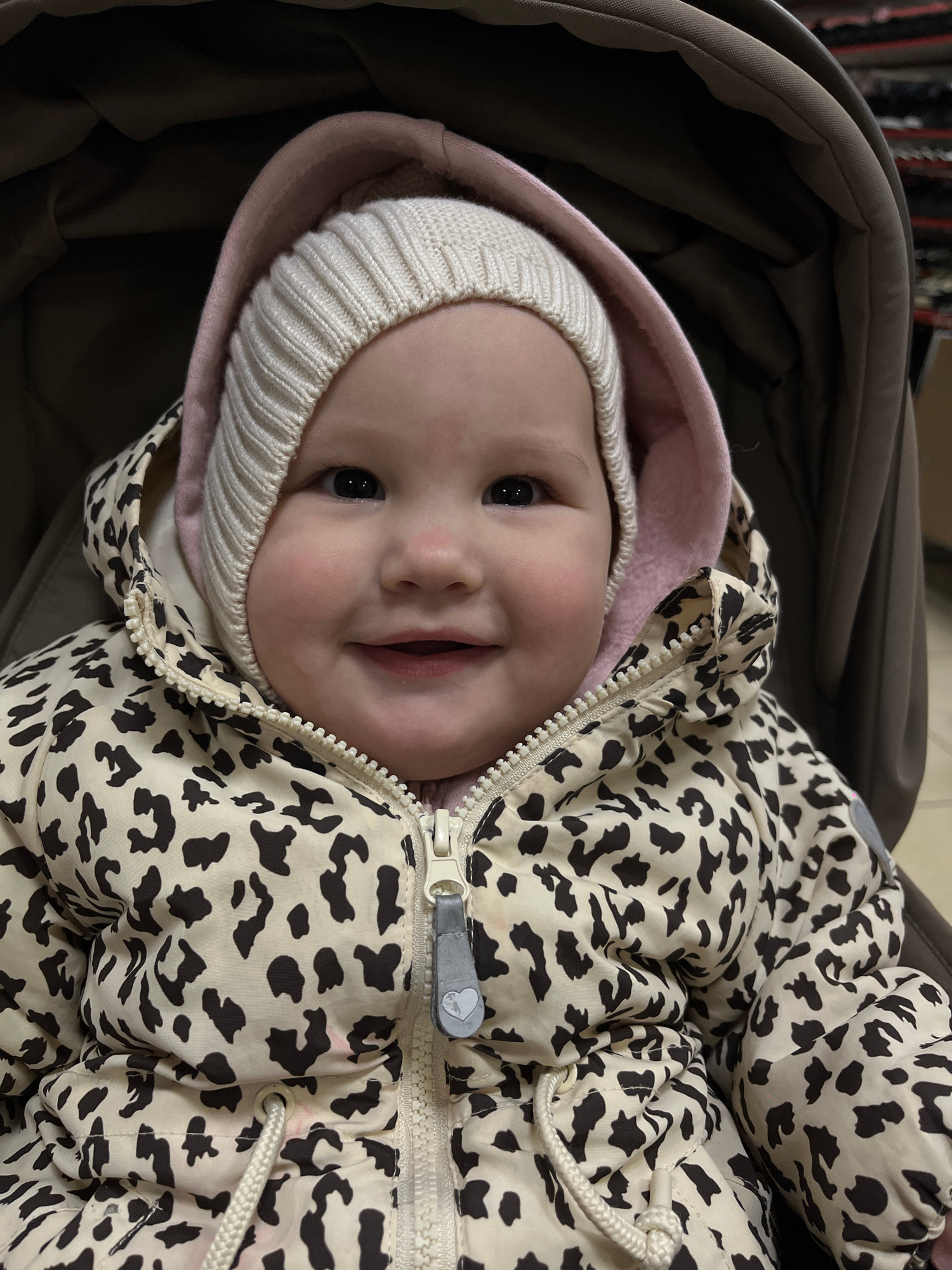 A baby is lying in a stroller, wearing a white knit hat and a leopard-print jacket with a pink lining in the hood. The baby is smiling at the camera. The stroller has a brown interior. No information…read more