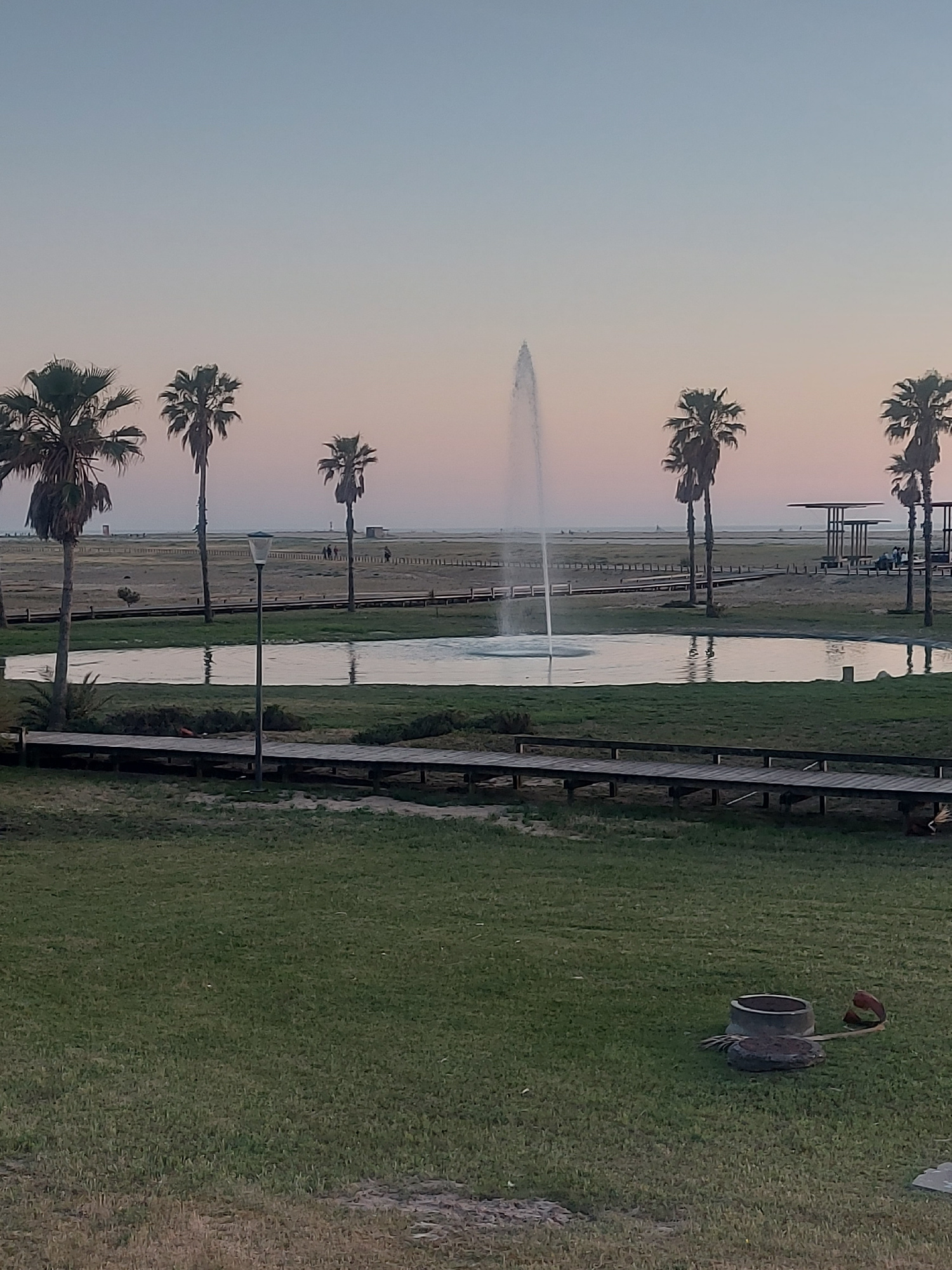 The image captures a scene in Figueira da Foz, Portugal. It presents a view with palm trees lining the landscape towards the horizon. A prominent water fountain is centrally positioned, adding an elem…read more