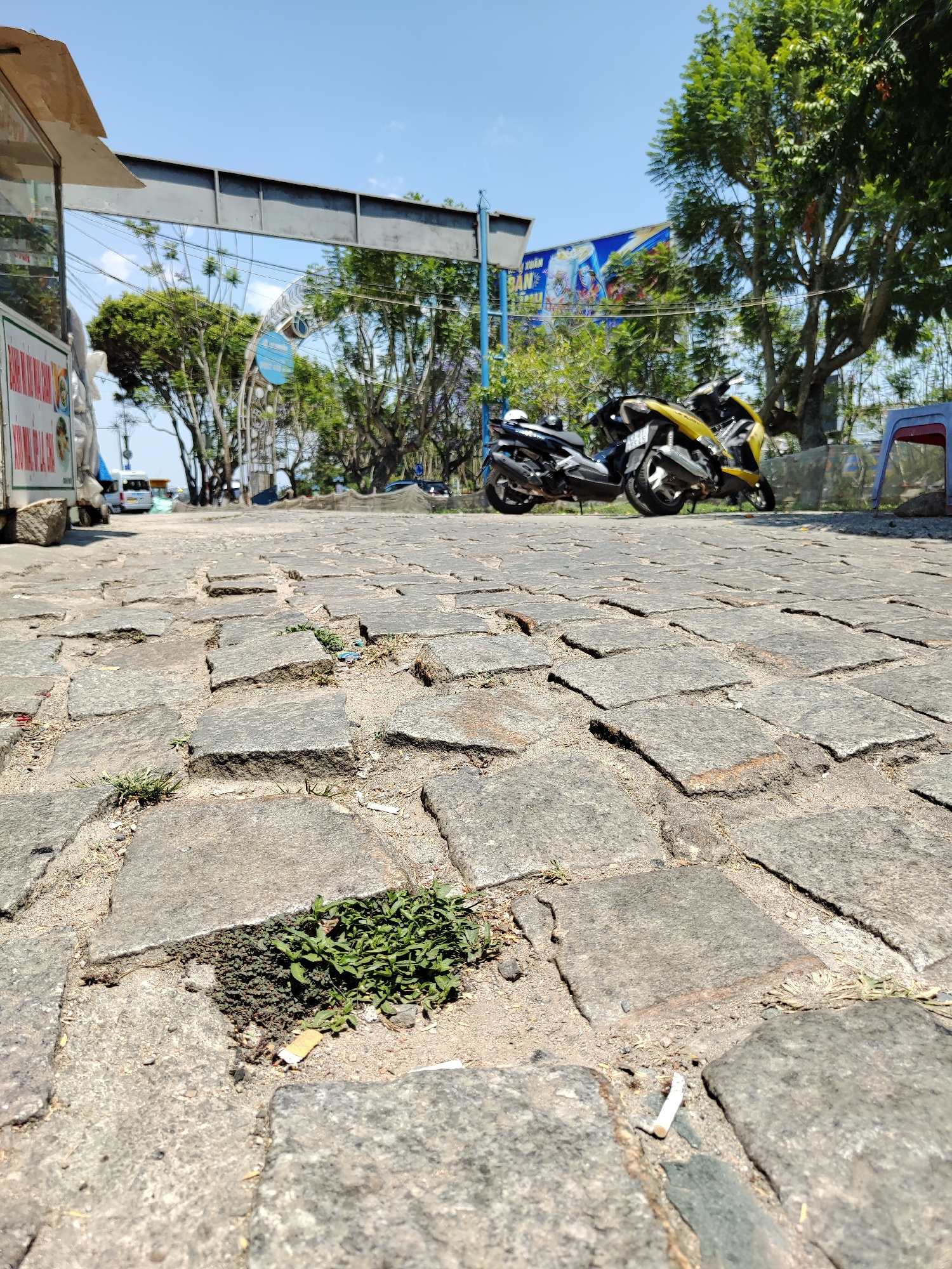 The image shows a stone-paved road in Da Lat, Vietnam. Weeds grow in the cracks between the stones. In the background, two parked motorbikes, one black and one yellow, sit near a sidewalk. Beyond the…read more