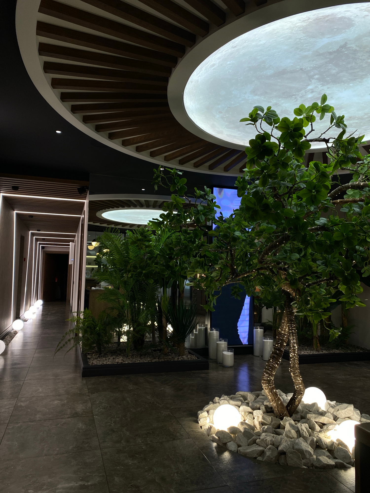 The image depicts an interior space featuring a design with celestial and nature-themed elements. A large, circular light fixture resembling the moon dominates the upper left of the frame, adjacent to…read more