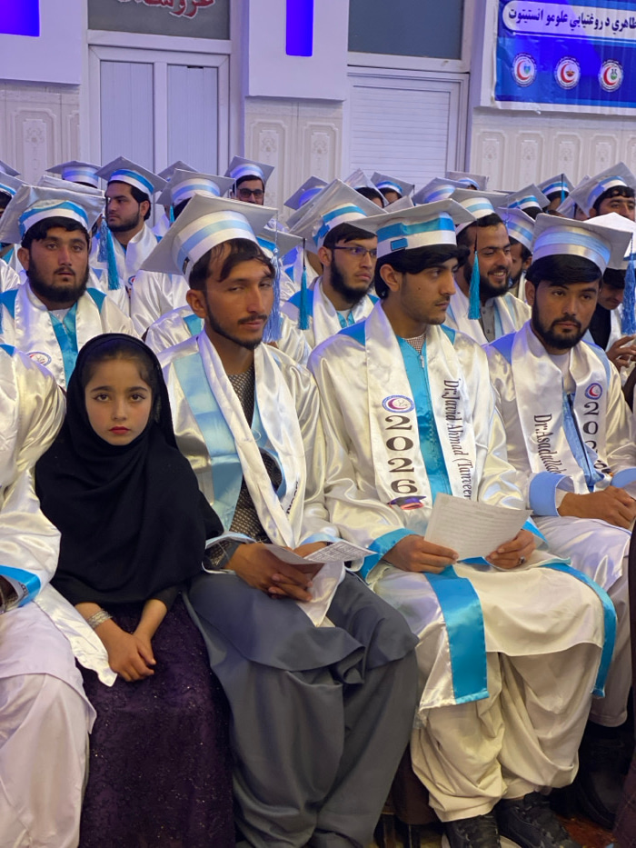A gathering of individuals in graduation attire, including white gowns and caps with blue accents, are seated indoors. The robes are adorned with "2026" and names like "Dr. Asadullah" and "Dr. Javid A…read more