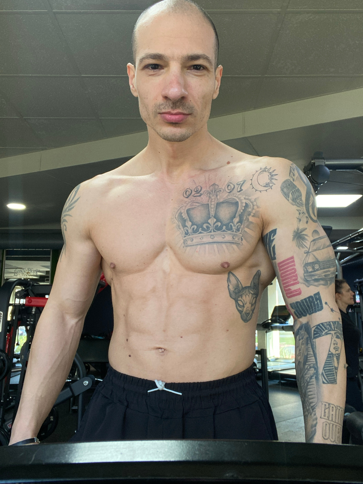A shirtless man with a shaved head stands indoors. He has numerous tattoos on his arms and chest, including a crown on his chest, the word "WORLD" on his right arm, and other various designs. He is we…read more