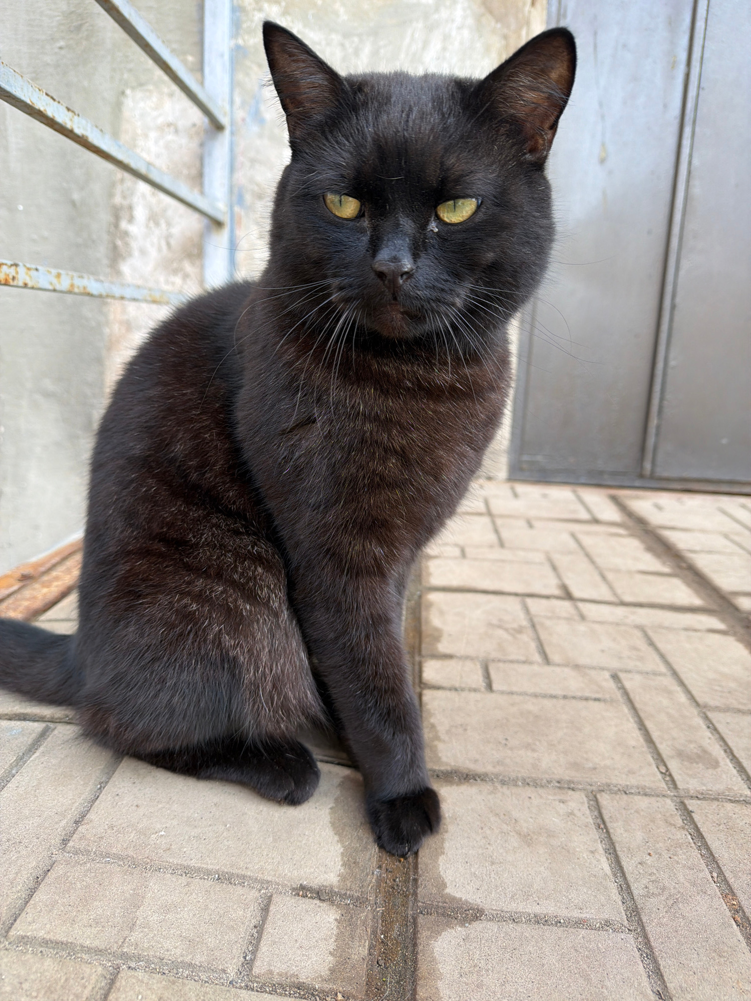 A black cat is lying on a gray tiled surface, partially extending one paw over the edge. The surface appears to be a sidewalk or patio area. A metal railing is visible on the left side of the image, s…read more