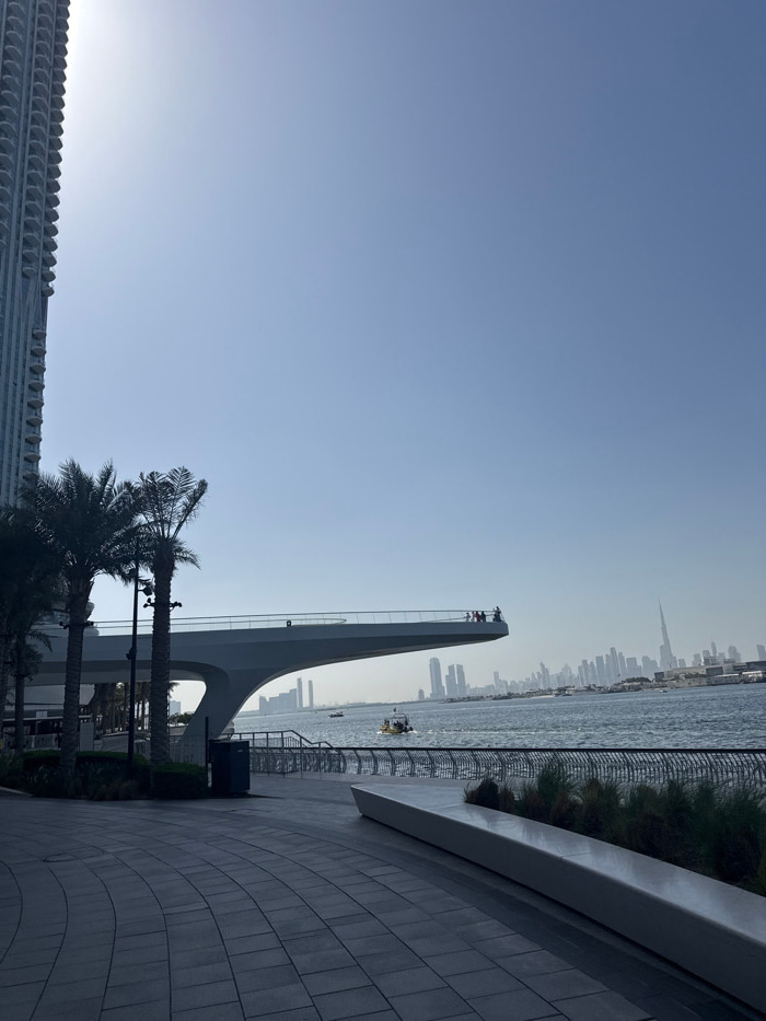 A daytime image depicts the Dubai Creek Harbour in Dubai, United Arab Emirates. In the foreground, a gray paved promenade with an intricate tile pattern curves to the right, bordered by a long, light-…read more