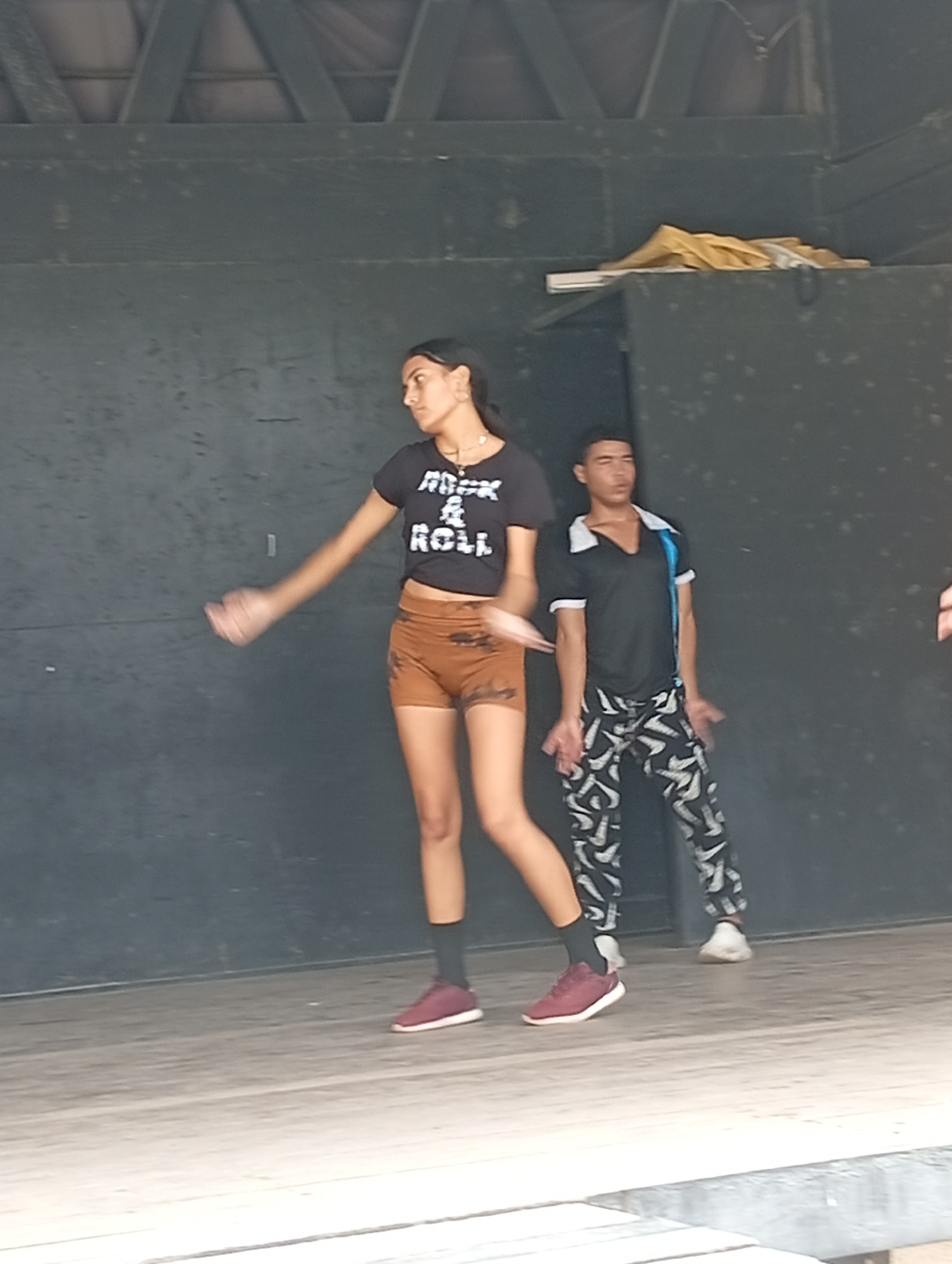 The image shows two people standing on a wooden stage in Playa El Agua, Venezuela. A young woman is on the left, wearing a black cropped t-shirt with "ROCK & ROLL" printed on it, brown shorts, black s…read more