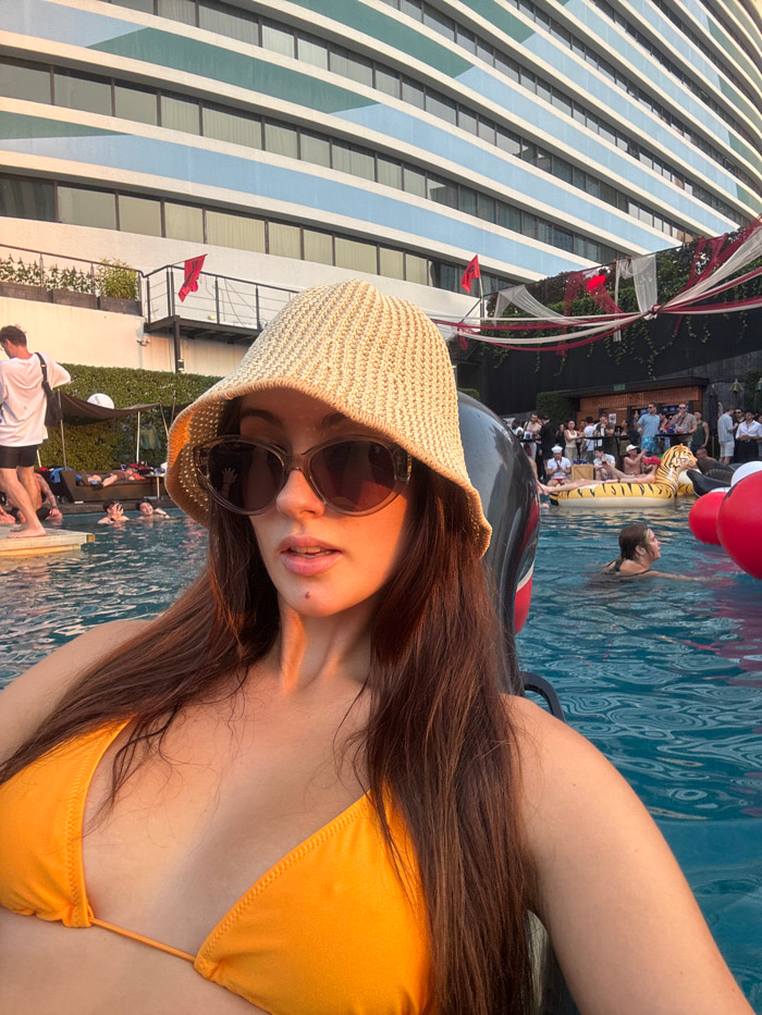 The image depicts a social gathering at the WET Deck pool of the W Bangkok hotel in Bangkok, Thailand. In the foreground, a female individual is partially submerged in a swimming pool, facing the viewer. She wears a light tan woven bucket hat and dark-tinted sunglasses, with long brown hair cascading over her shoulders. Her attire consists of an orange bikini top. Her lips are slightly parted, and a small mole is visible on her chin. A dark, indistinct object is positioned behind her right shoulder. The blue-tiled swimming pool occupies the lower and mid-sections of the frame. In the background, other individuals are present within the pool and on its periphery. To the left, multiple people are near the pool edge, some relaxing on lounge chairs, while one male figure in a white t-shirt stands. To the right, a woman with dark hair is swimming, and a large inflatable tiger float, occupied by another person, is visible alongside several large red spherical floats. Beyond the pool, a raised area features a dark wall extensively covered in green foliage, adorned with draped white and red fabric streamers. Red flags are mounted on poles in this section. Further back, a crowd of people is gathered on a patio or deck, suggesting a celebratory event. The upper background is dominated by the multi-story hotel building, characterized by prominent horizontal bands of light blue/aqua and white/light gray paneling interspersed with dark-tinted windows. The scene is illuminated by natural sunlight, indicating an outdoor, daytime setting, likely late afternoon. | Open Wire