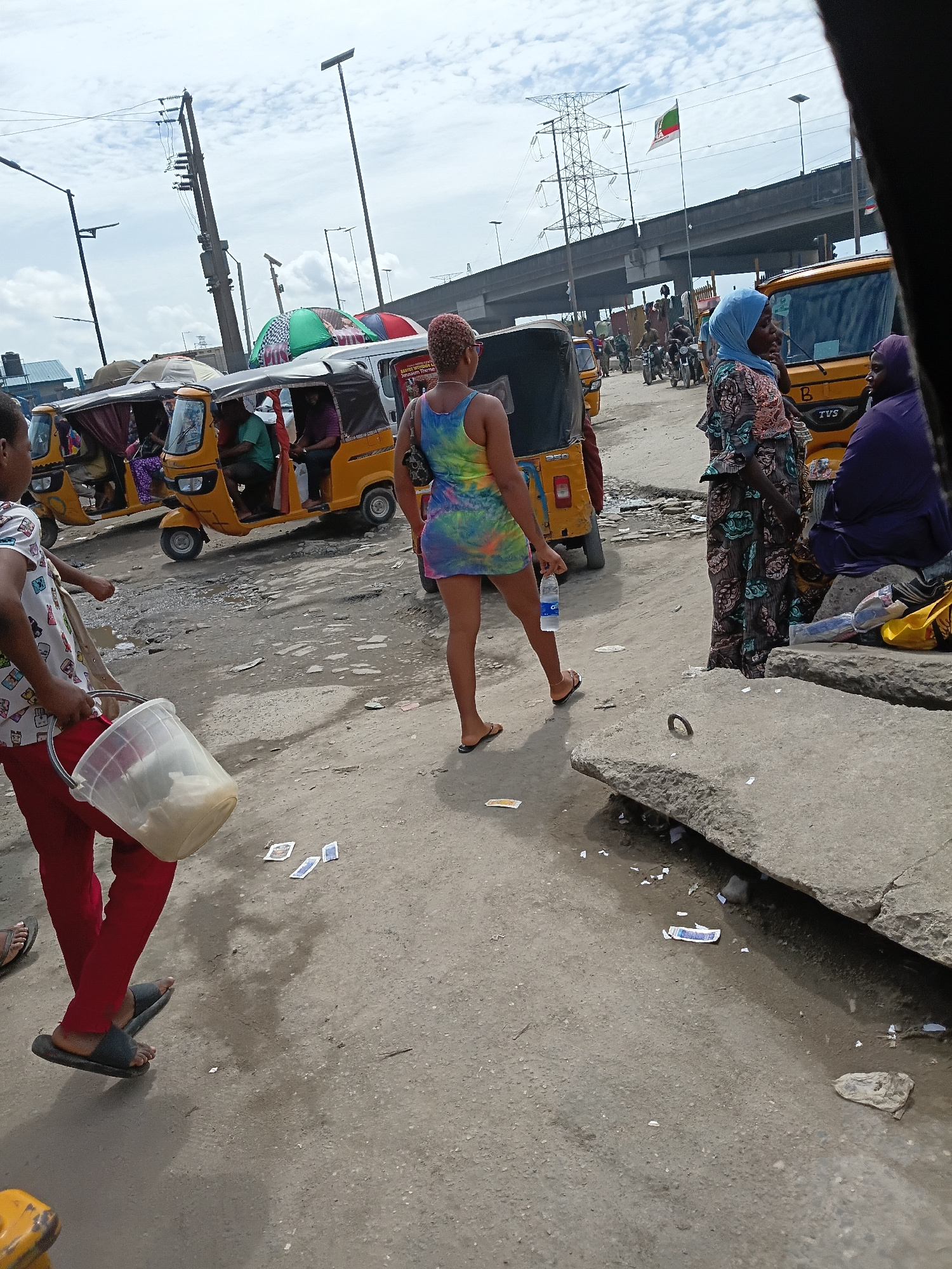 The image depicts a street scene in Lekki, Nigeria. The ground is concrete with litter scattered around. Several yellow "keke" auto-rickshaws are parked along the roadside. People are present, includi…read more