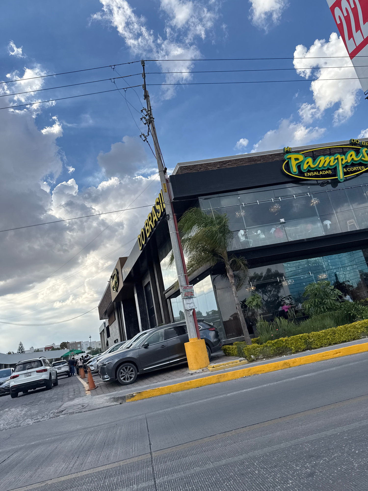 The image captures a street scene in San Bernardino Tlaxcalancingo, Mexico. Prominently featured is the building of the "Mr. Pampas" restaurant, identifiable by its yellow and green logo. The building…read more