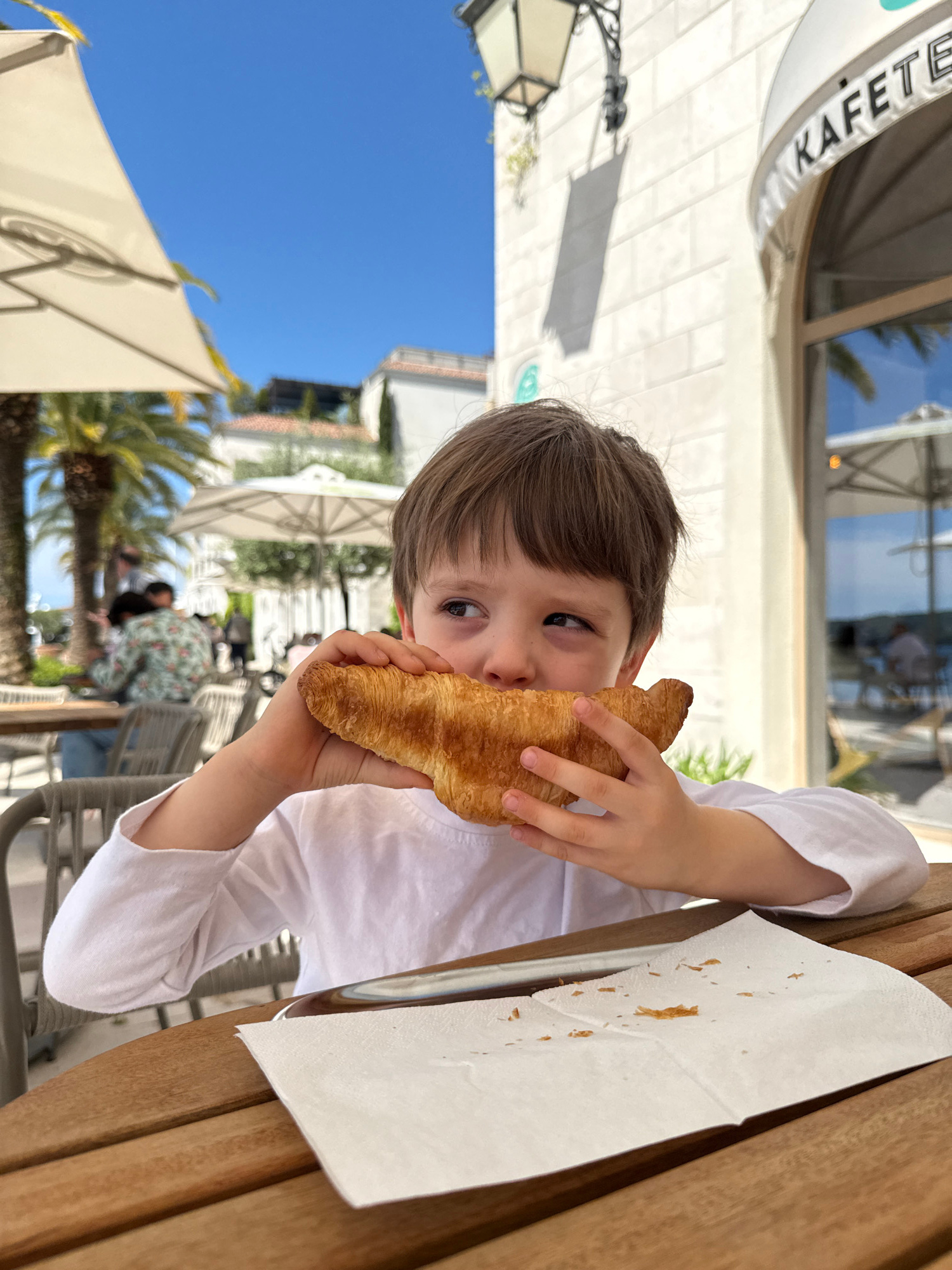 A child with brown hair, wearing a white shirt, holds a croissant in both hands and is about to eat it. The photo appears to have been taken at the Porto Montenegro marina in Tivat, Montenegro. Visibl…read more